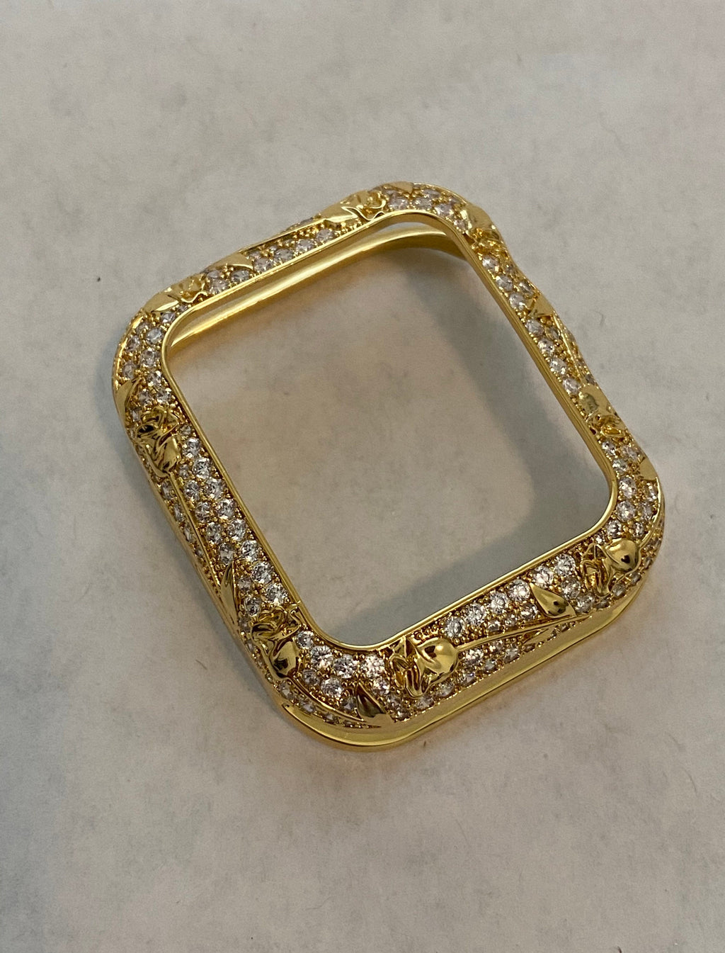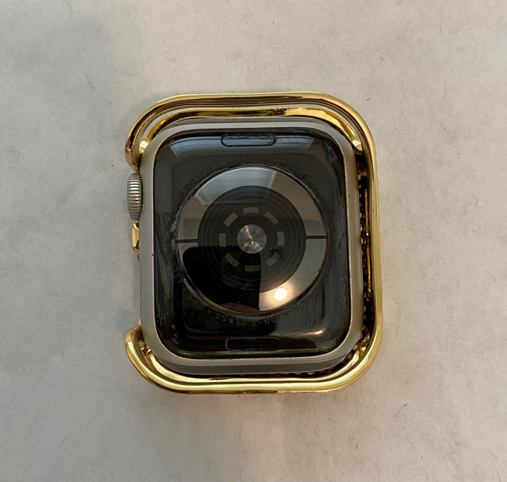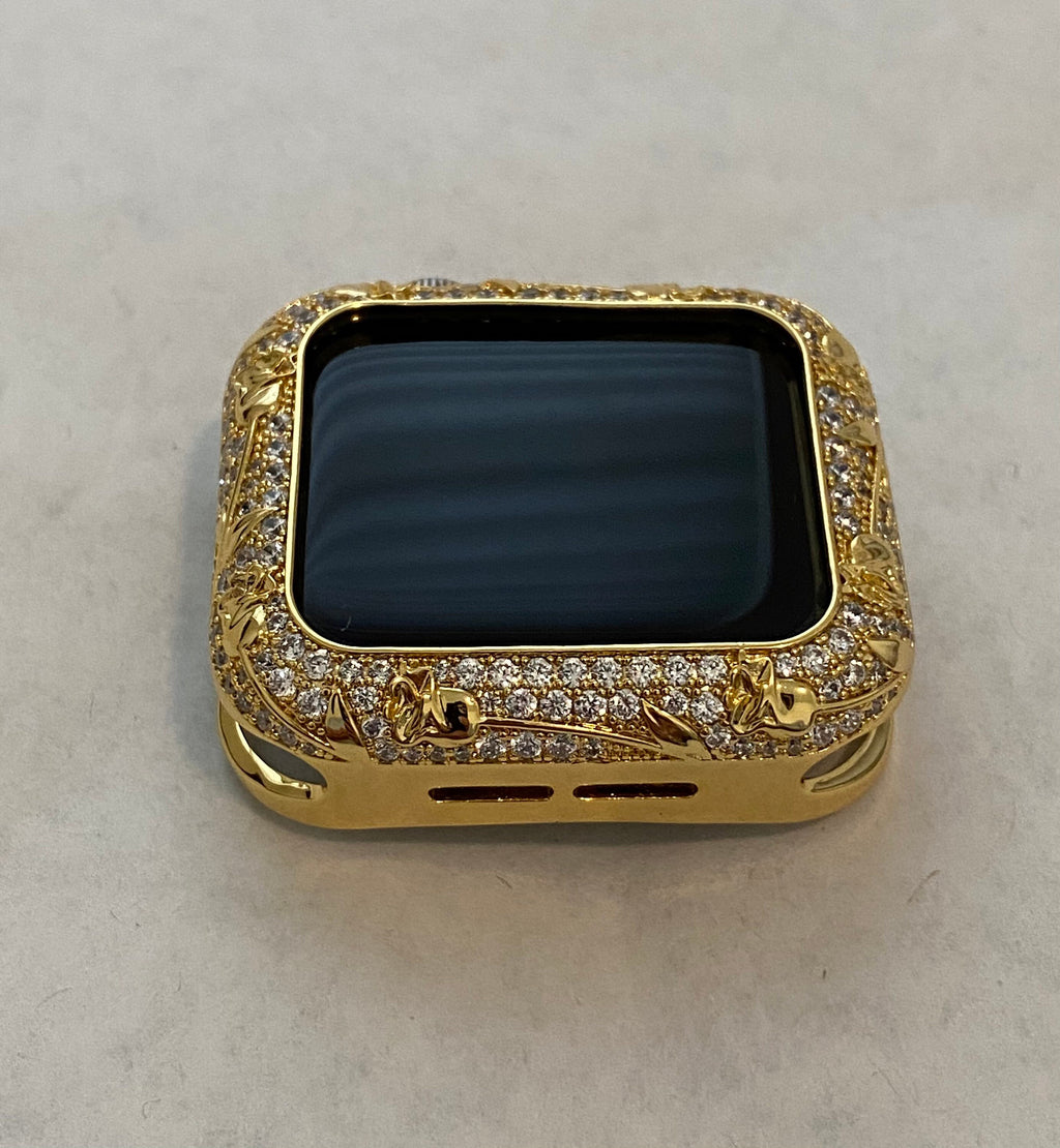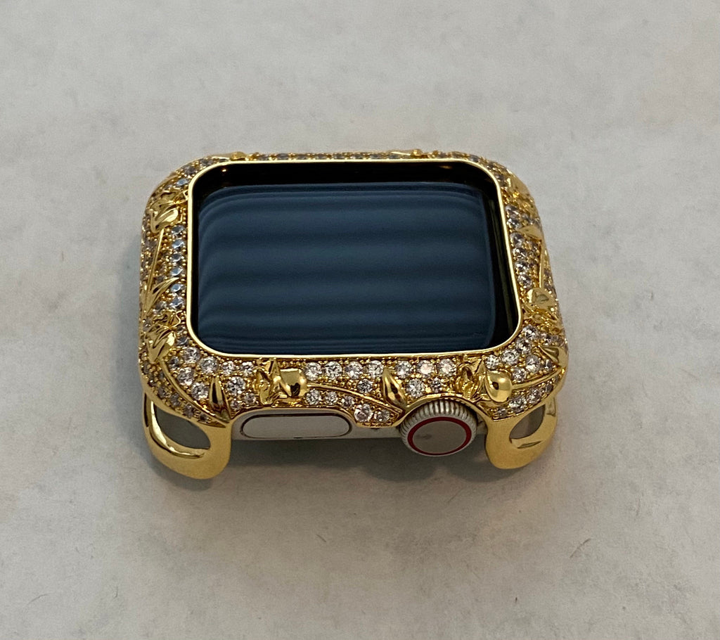 Fits the Apple Watch available for sizes 38mm 40mm 42mm 44mm Series 2-6 SE Men's & Women's. Pretty floral design yellow Gold Metal Apple Watch Case Bezel with hand set High End Swarovski Crystals in a pretty rose bud design. Fits easily over your apple watch and once watch straps are attached it holds this apple watch case in place. An apple watch band must be attached for this apple watch cover to fit properly. Due to the style with no bars on the back it will fit looser than the apple watch cases style with 2 bars.