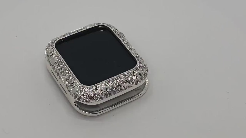 Fits the Apple Watch for sizes 38mm 40mm 41mm 42mm 44mm 45mm in series 2-9 or SE Men's & Women's. This is a custom design made to fit the Apple Watch, it is not a brand copy. Luxury Silver Metal Apple Watch Case with inset High End Crystals in a pretty floral design. Fits easily over your watch sizes 38mm 40mm 41mm 42mm 44mm 45mm. Once watch straps are attached it holds the apple watch case in place. A apple watch band must be attached for this bezel to fit properly. Due to the style with no bars on the back it will fit looser than the style with 2 bars.
