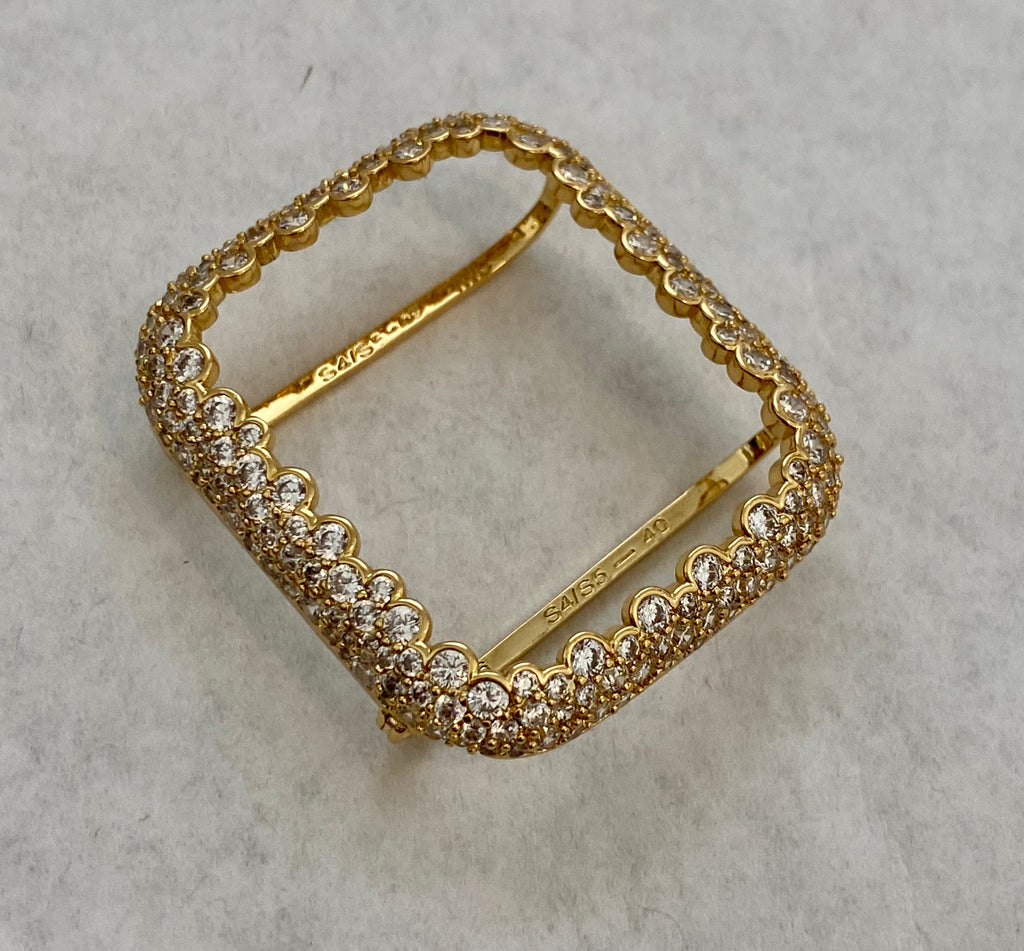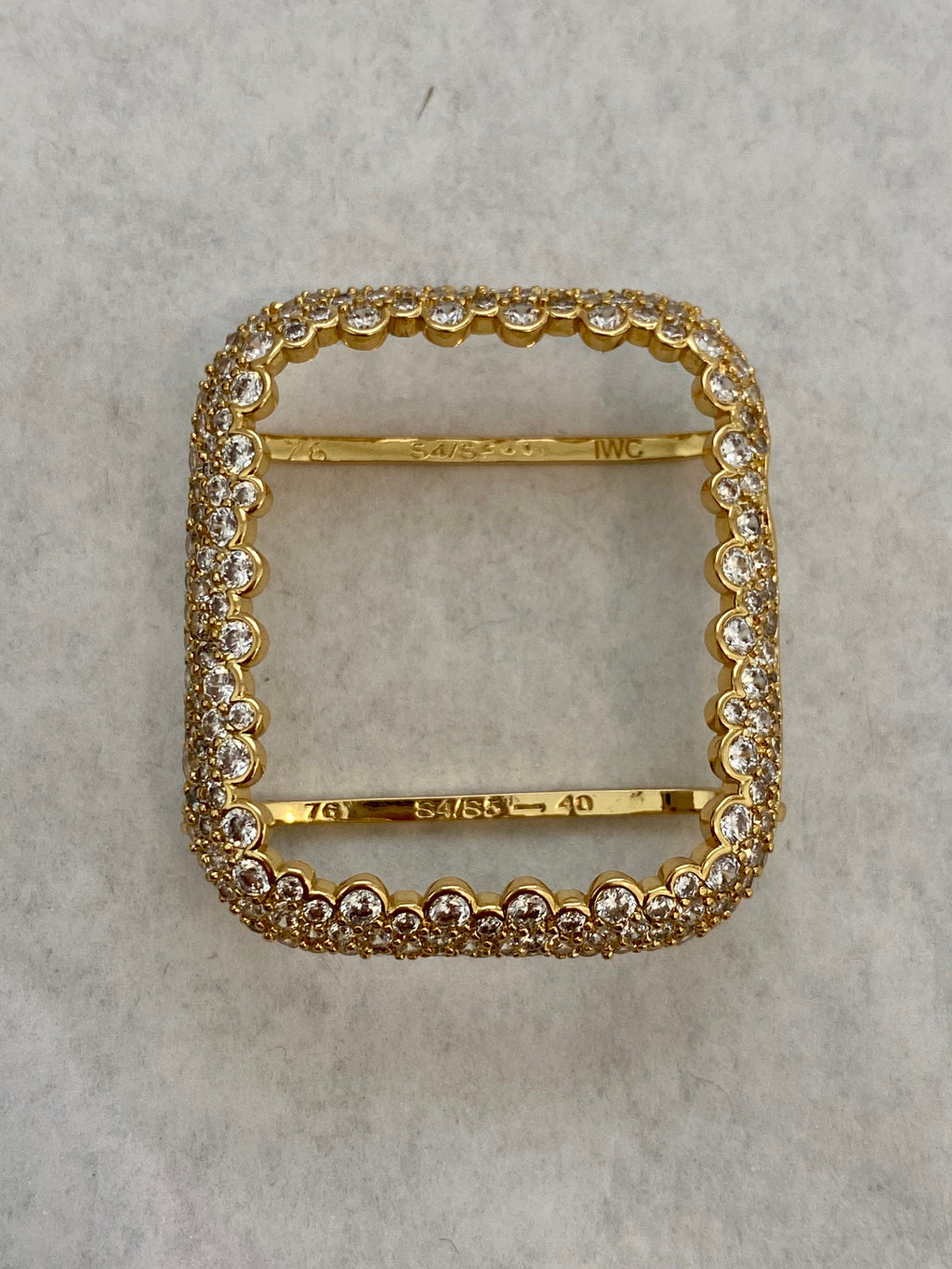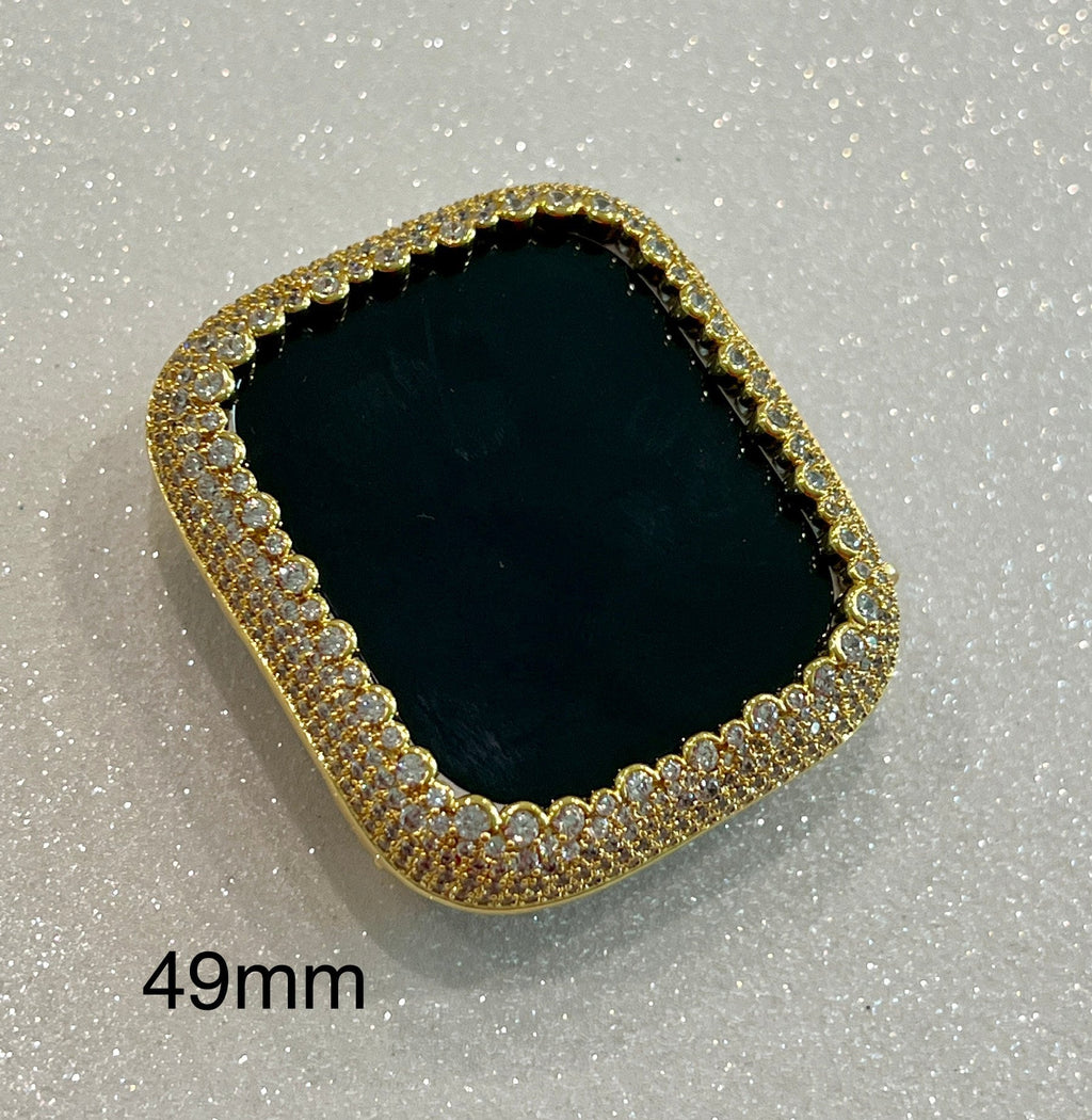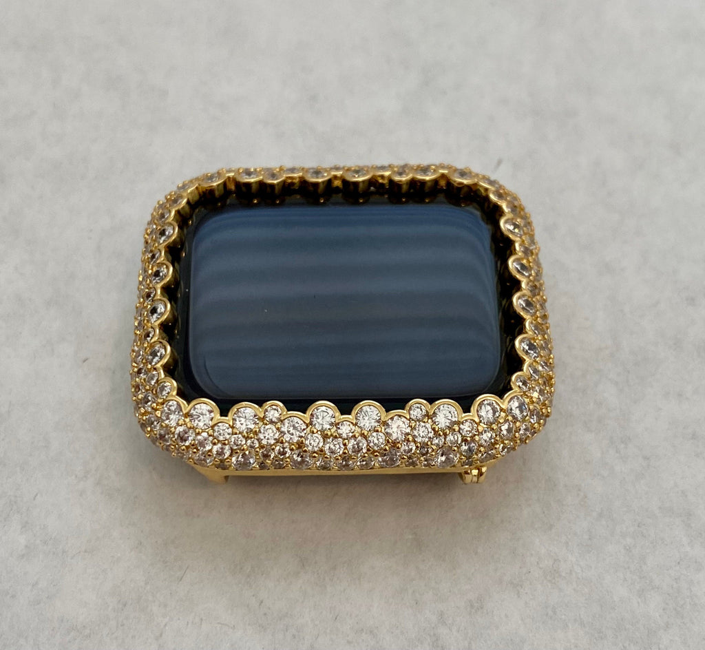 Fits the Apple Watch available for sizes 38mm 40mm 41mm 42mm 44mm 45mm 46mm Series 2-11 SE Ultra 1/2/3 Men's & Women's (see photo labeled 49mm-slightly different due to watch design) . This is a custom design made to fit the Apple Watch, it is not a brand copy.Gold Apple Watch Bezel Cover is a Custom 14k Gold Plated Metal Bezel style case cover with hand set Large lab diamonds around the face and micro pave lab diamonds on the sides. . Pretty Champagne Bubbles Very Elegant.