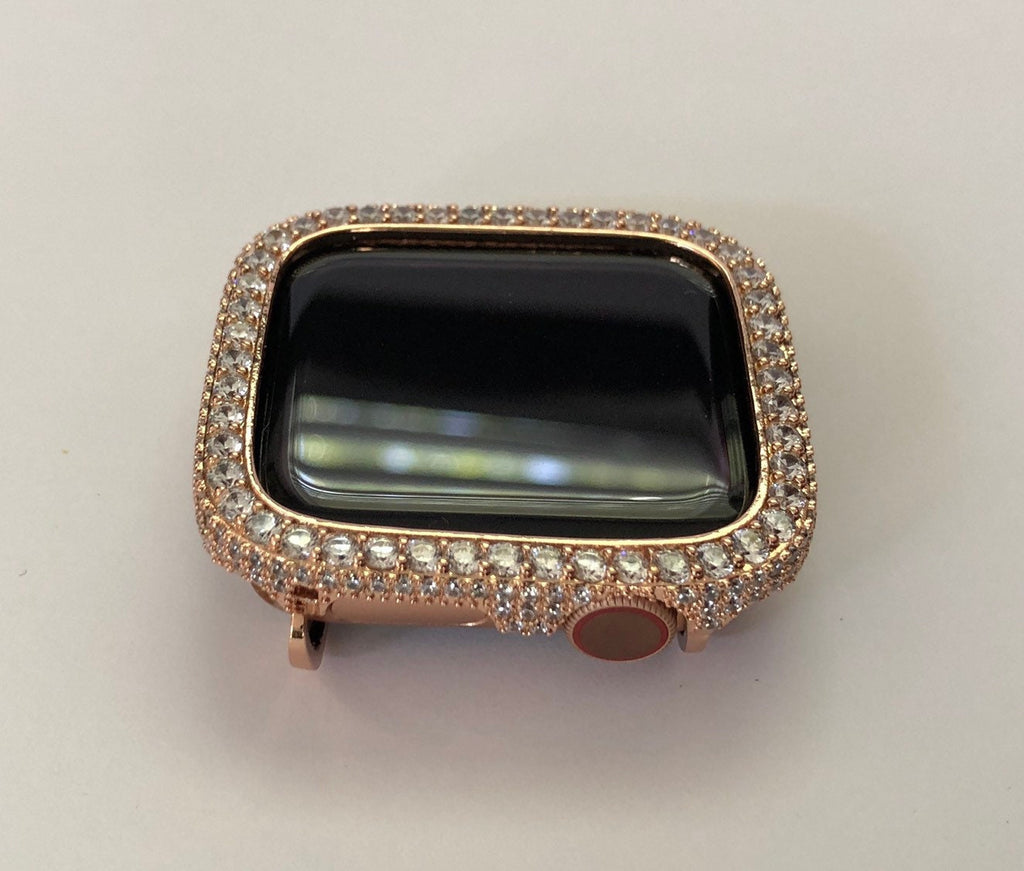 Apple Watch Case Materials: 14kt rose gold plating over a metal base with hand set 2.5mm and pave lab created diamonds. Two bars on the back hold the Apple Watch in place with access to all buttons. There is NO screen protector. Instructions Included.