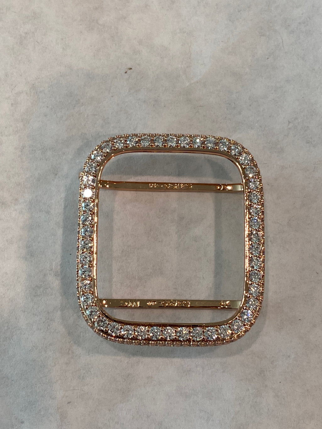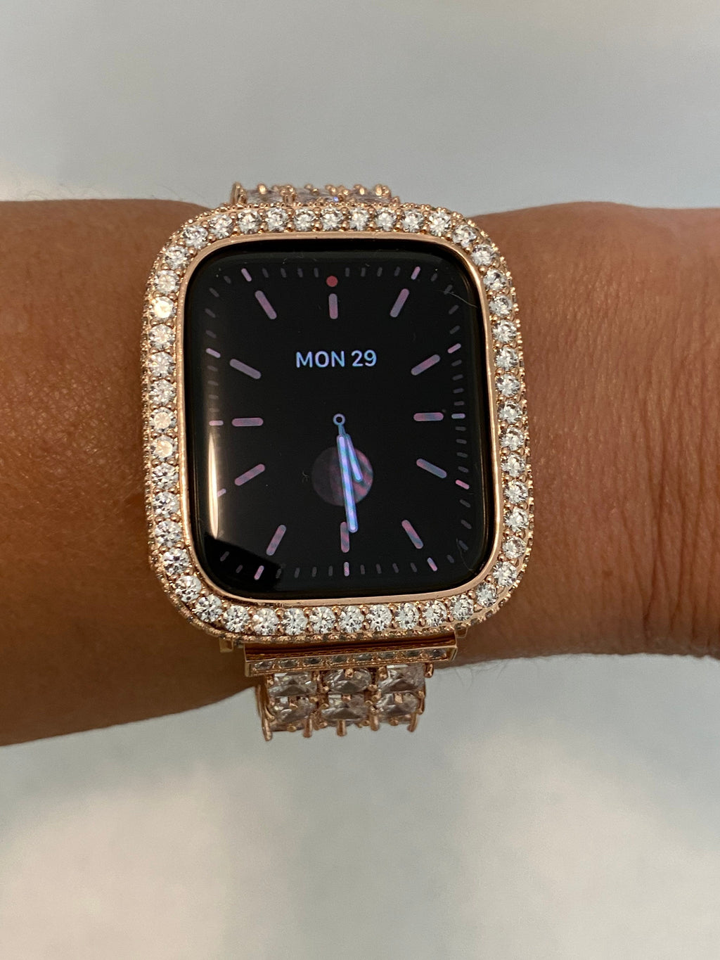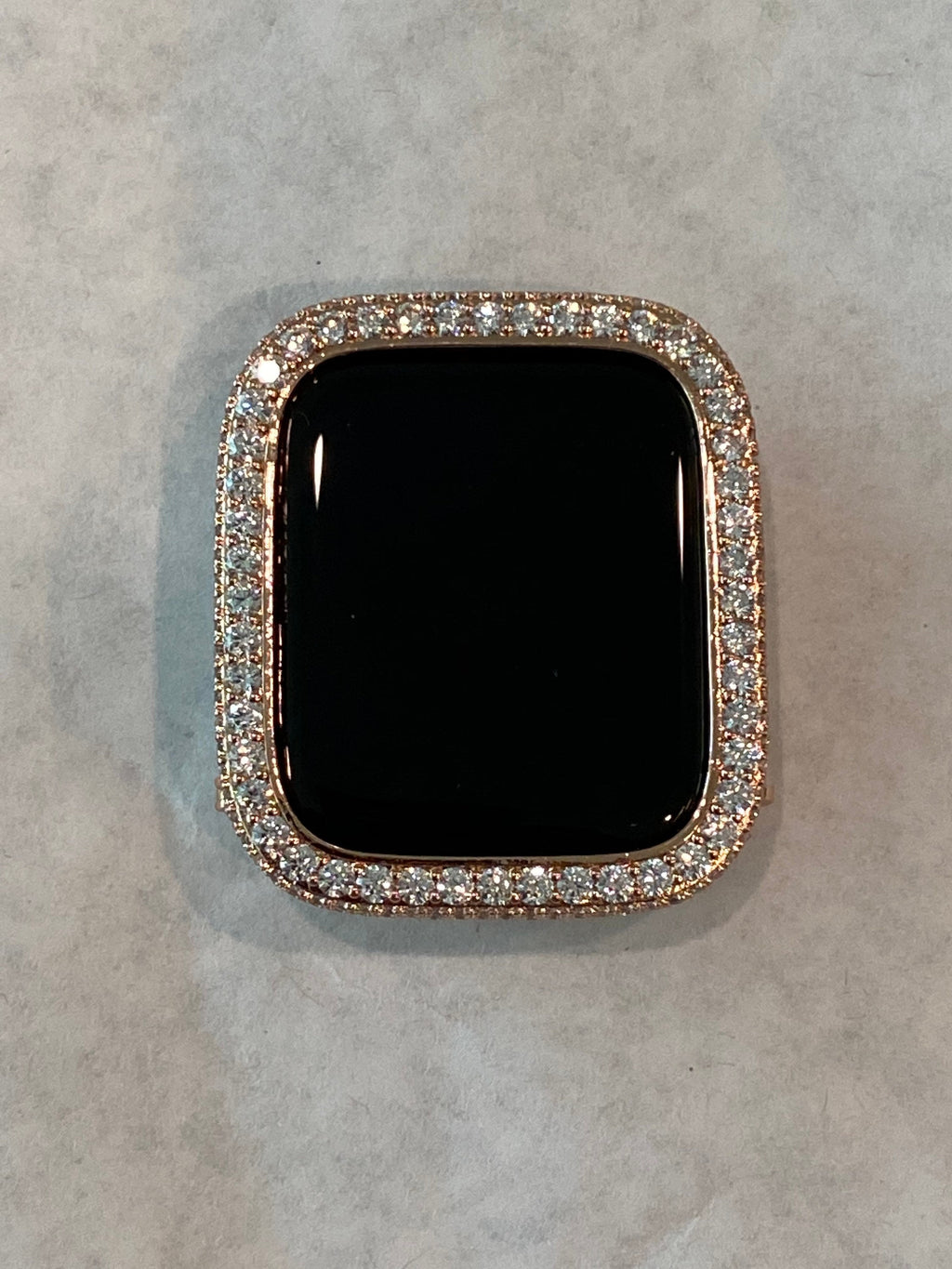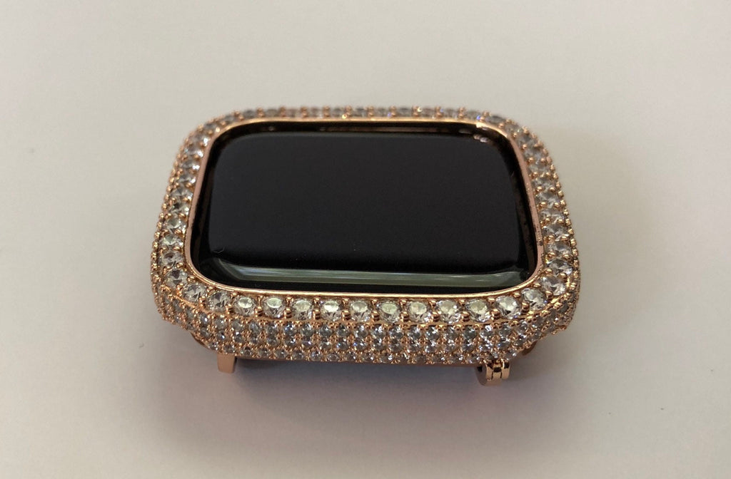 Apple Watch Case Materials: 14kt rose gold plating over a metal base with hand set 2.5mm and pave lab created diamonds. Two bars on the back hold the Apple Watch in place with access to all buttons. There is NO screen protector. Instructions Included.