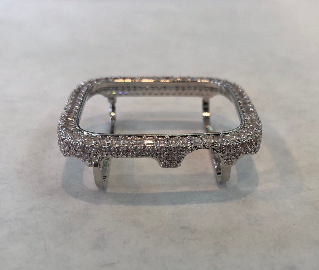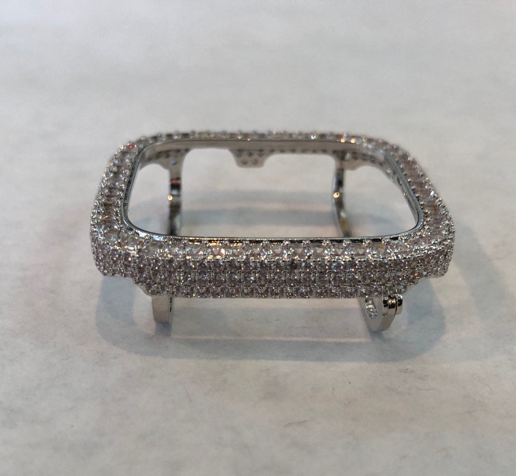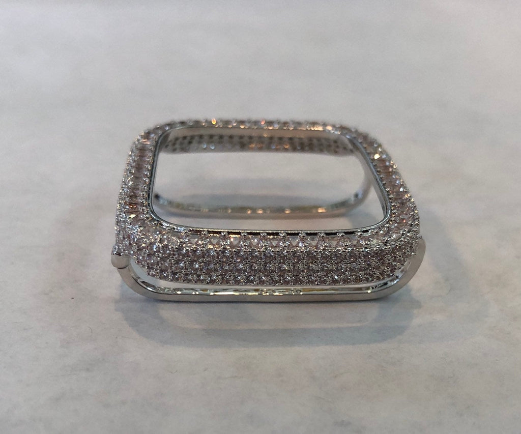 Fits the Apple Watch available for sizes 40mm in series 4,5,6 or SE Men's & Women's. Custom Apple Watch Cover in 14k White Gold Plated Metal a bezel style case cover with Large High quality 2.5mm square lab diamonds around the face and micro pave lab diamonds on the sides. Stones are not too big yet have a big presence. Very Elegant. Band in video or photos is not included.