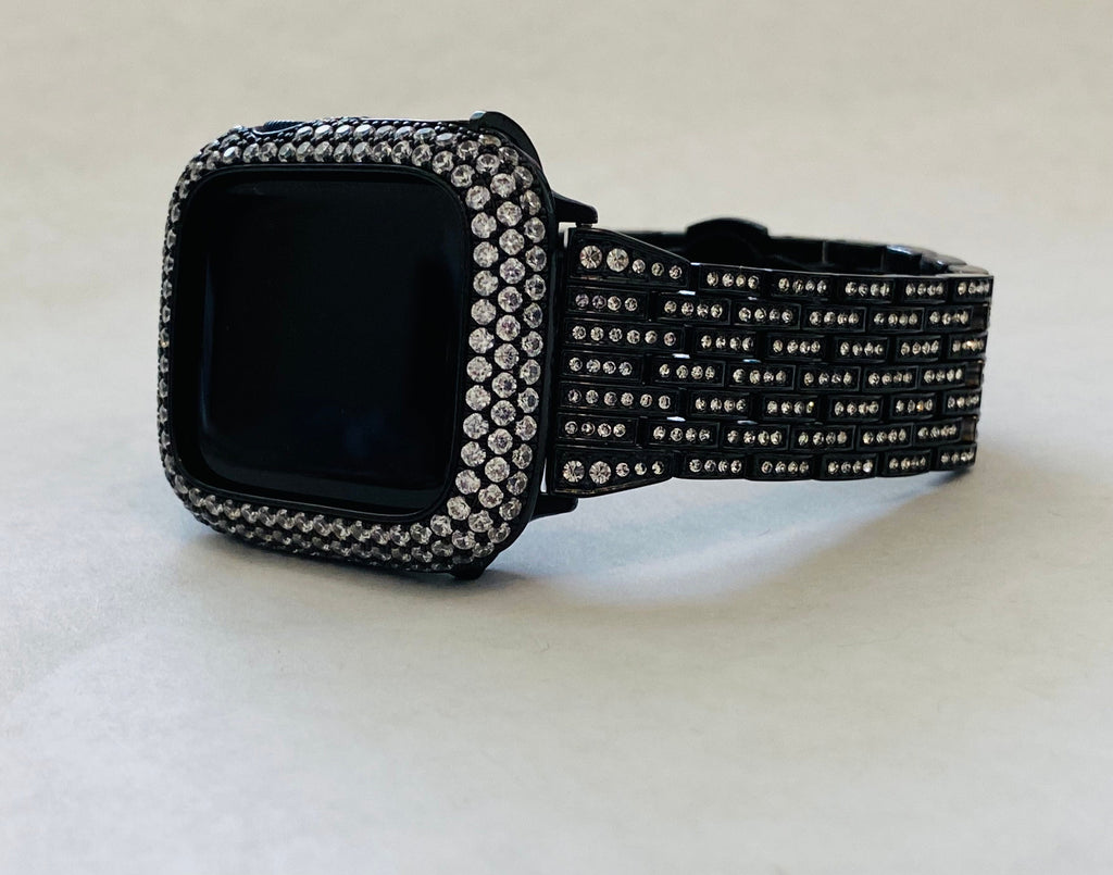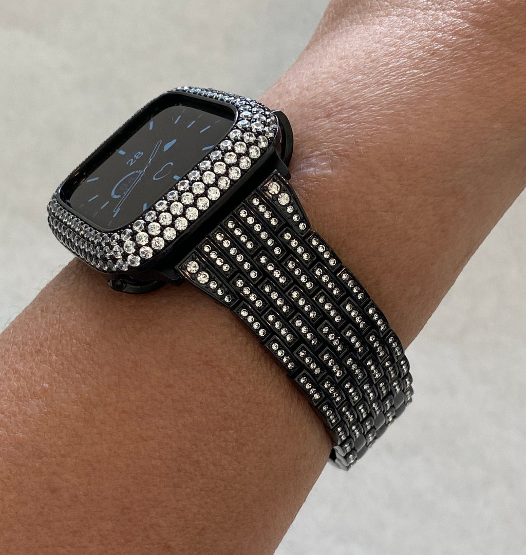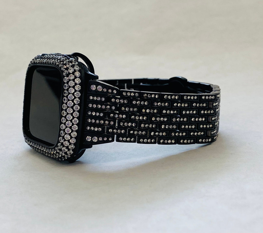 This beautiful Apple watch band or case Fits the Apple Watch available for sizes 38mm 40mm 41mm 42mm 44mm 45mm 46mm Series 2-11 SE Ultra 1/2/3 Men's & Women's. It is high on the bling with a black stainless steel band that features rows of High End Crystals. For the ultimate in sparkle, add the matching Apple Watch Case in rhodium plated bezel with even more rows of gleaming high quality hand set micro pave lab diamonds. The ideal watch band for any fancy occasion!