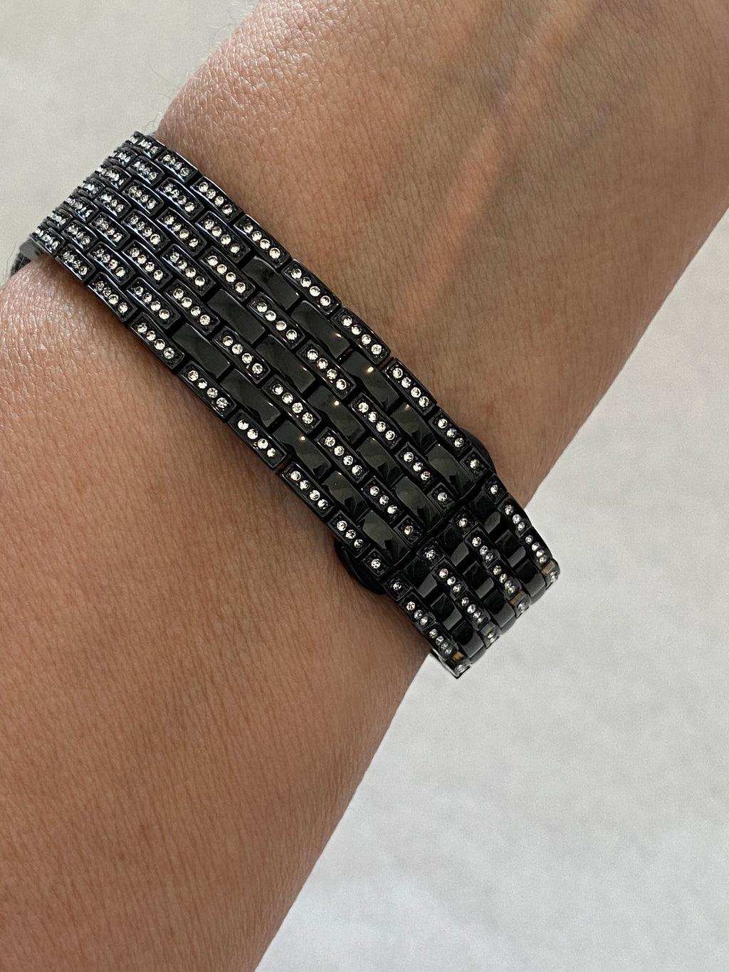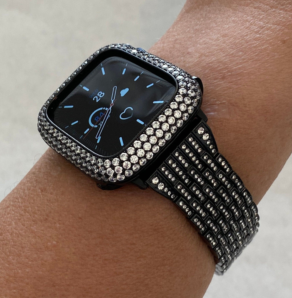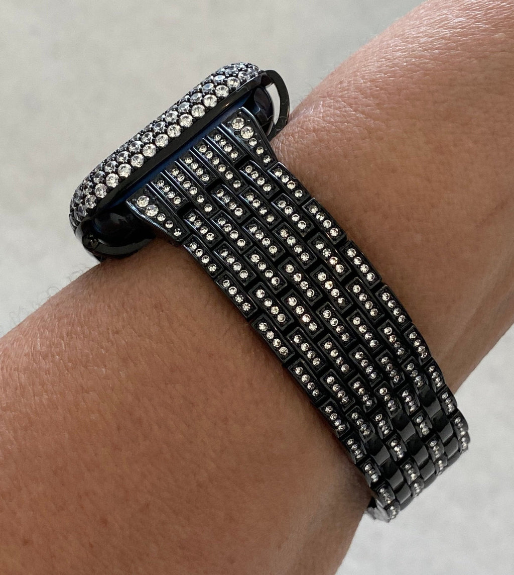 This beautiful Apple watch band or case Fits the Apple Watch available for sizes 38mm 40mm 41mm 42mm 44mm 45mm 46mm Series 2-11 SE Ultra 1/2/3 Men's & Women's. It is high on the bling with a black stainless steel band that features rows of High End Crystals. For the ultimate in sparkle, add the matching Apple Watch Case in rhodium plated bezel with even more rows of gleaming high quality hand set micro pave lab diamonds. The ideal watch band for any fancy occasion!