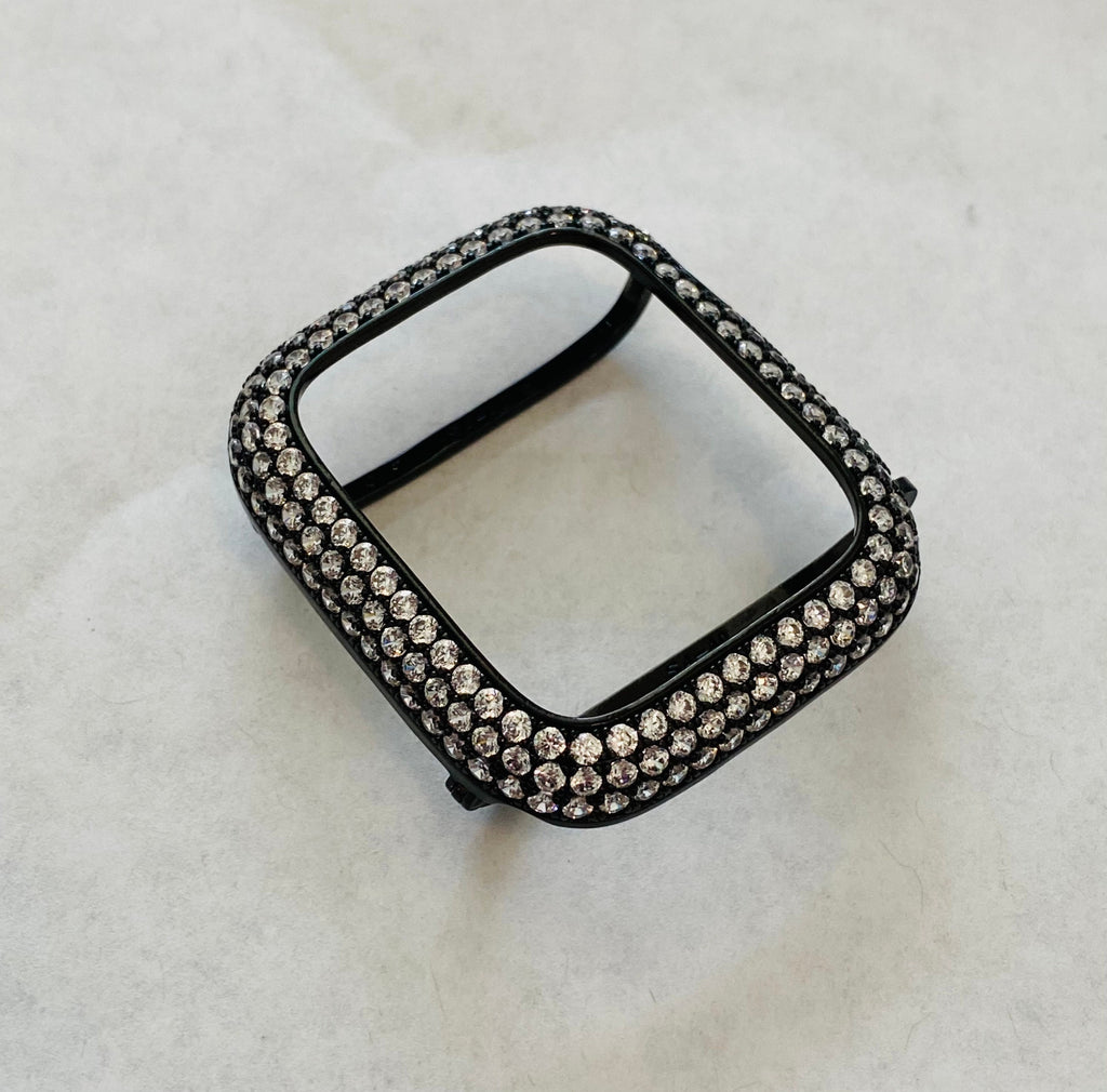 This apple watch cover is studded with high quality pave hand set lab diamonds set in a Rhodium plated metal bezel. The apple watch case has two bars on the back that hold the apple watch in place with access to all buttons, no screen protector. ***Apple Watch Is not Included***