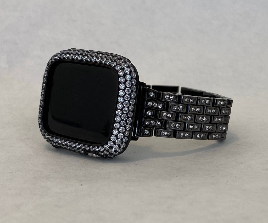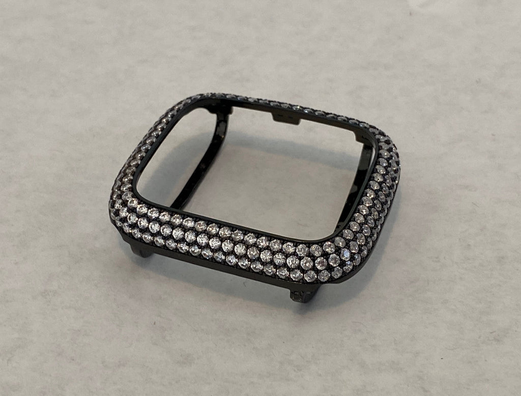 Add a Black Apple Watch Case Cover Custom 14k gold Rhodium Plated Metal Bezel style case cover with micro pave lab diamonds. Two bars on the back hold the watch firmly in place, easy to get on and off. Access to all button.