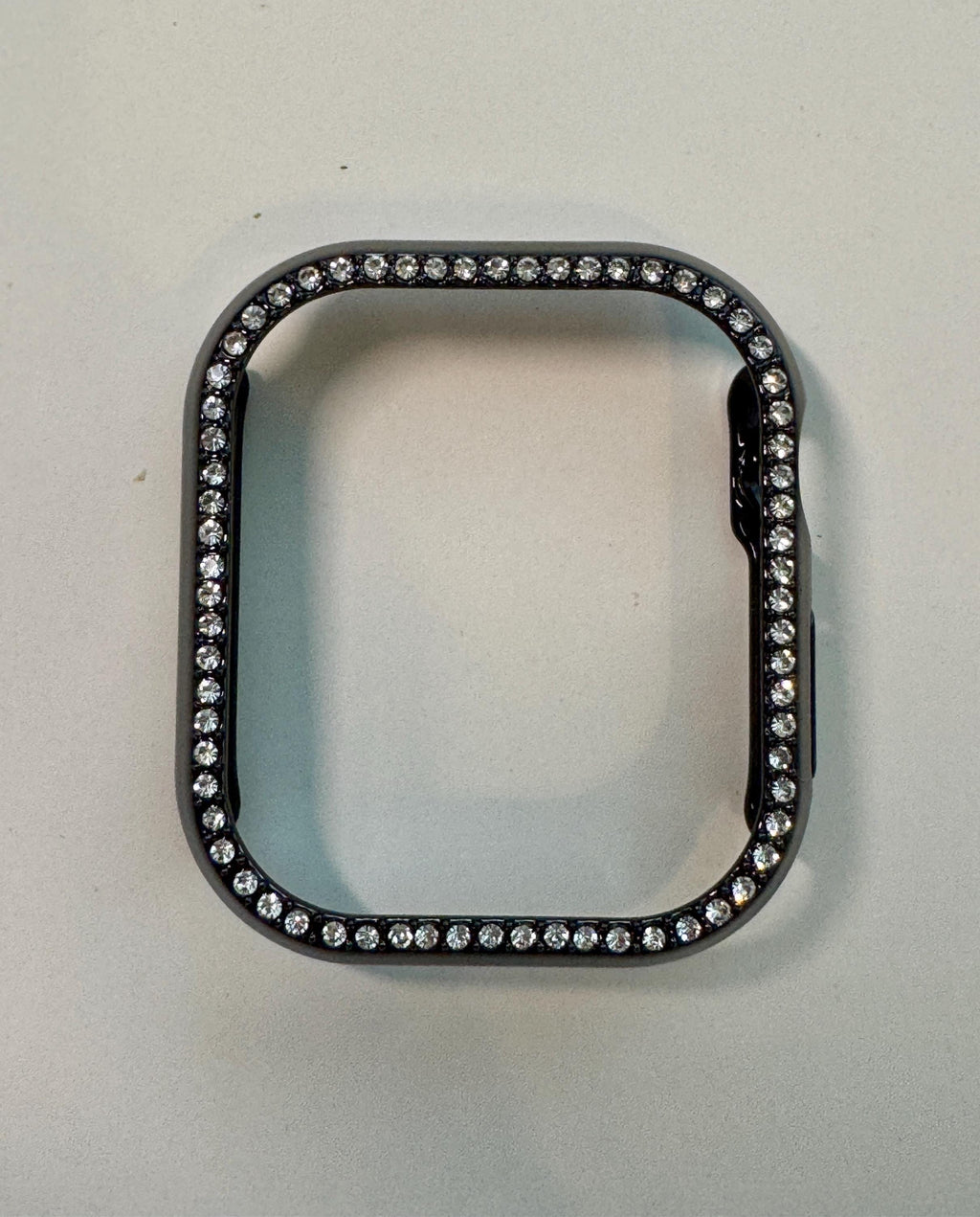 Fits the Apple Watch in sizes 41mm 45mm Series 7/8/9, 42mm 46mm Series 10/11, 49mm Ultra Series 1/2/3. This Apple Watch Case Cover features 1 row of large High End Swarovski Crystals set in a polished black metallic poly carbonate hard frame. This hard frame resists scratches, wear and tear. Easy snap on style with access to all buttons. There is no plastic screen and it is not made of metal. Buttons holes vary based on watch size and series.