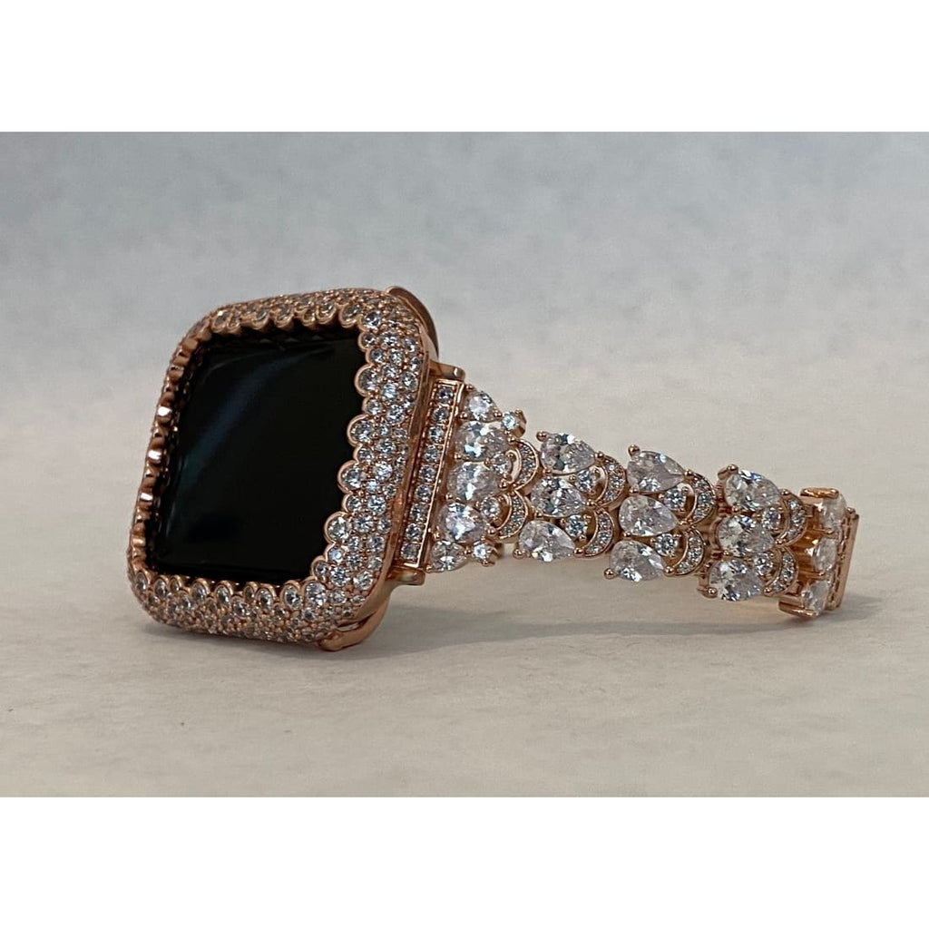 Luxury Custom Rose Gold Apple Watch Band Women's Fashion. Hand Set Large Pear Shaped Swarovski Crystals set in a high polish rose gold plated band.