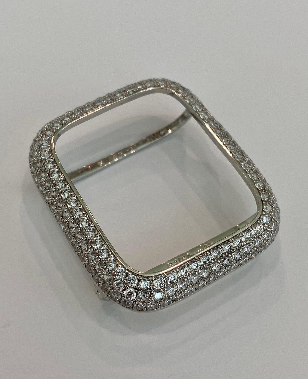 Add the Silver Apple Watch Cover custom 14k white gold plated Bezel with high quality hand set micro pave lab diamonds. Two bars on the back hold the apple watch case in place with access to all buttons, no screen protector.