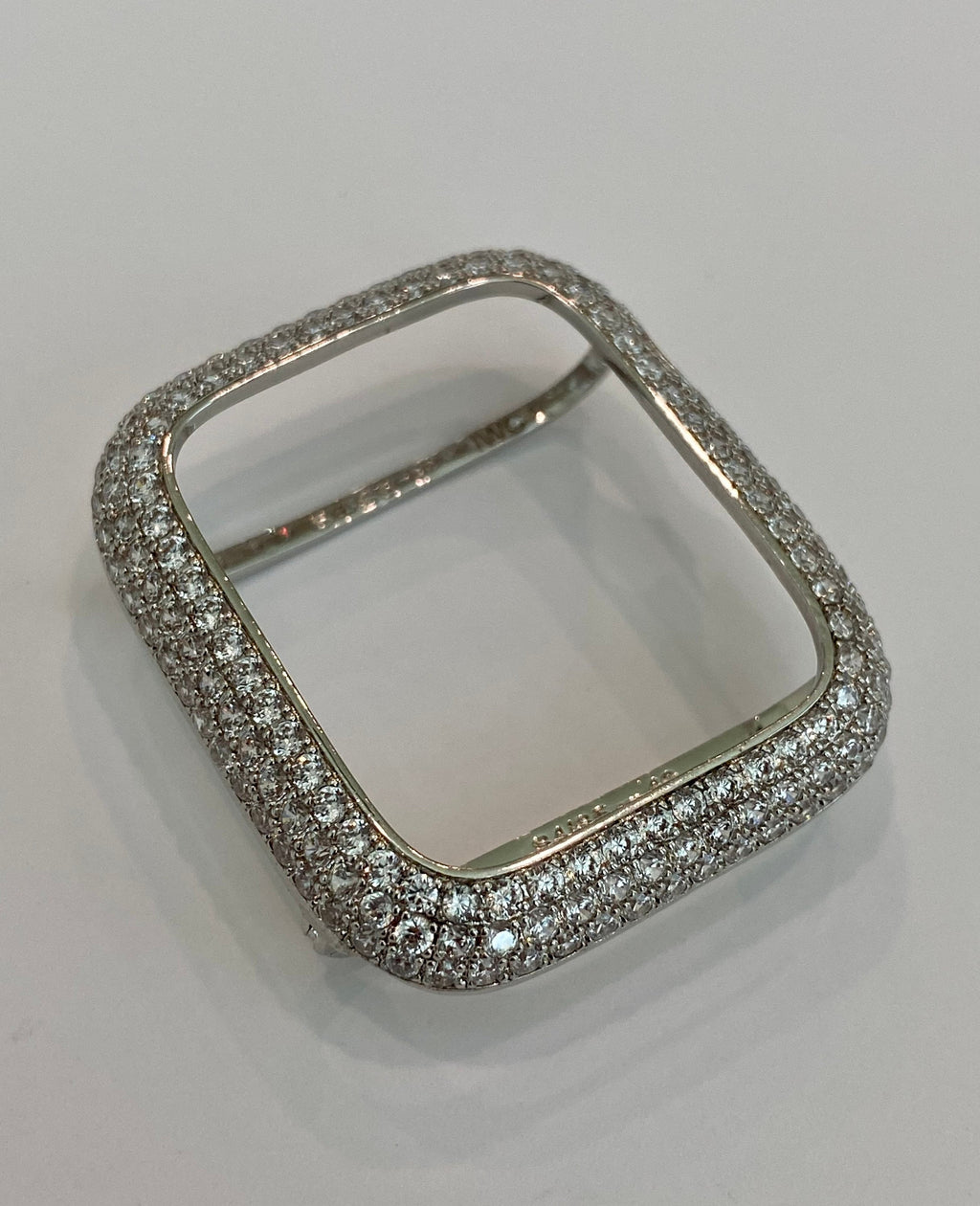 Apple Watch Case Materials: 14kt White gold plating over a metal base with hand set pave lab created diamonds. Two bars on the back hold the Apple Watch in place with access to all buttons. There is NO screen protector. Instructions Included.