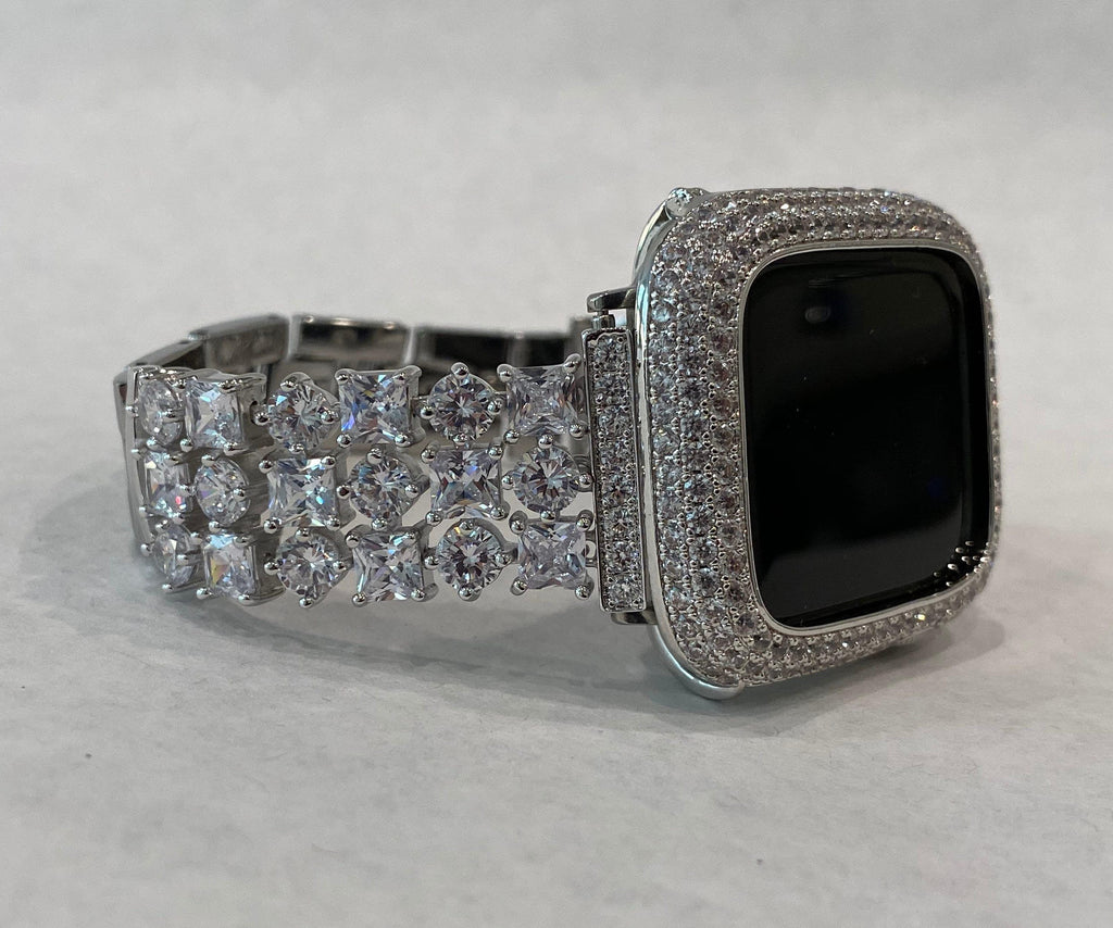 Fits the Apple Watch available for sizes 38mm 40mm 41mm 42mm 44mm 45mm 46mm 49mm Ultra 1/2 Series 2/10 SE Men's & Women's. This is a custom design made to fit the Apple Watch, it is not a brand copy. Silver Apple Watch Band Women Style Iwatch Band with Hand Set Large High End Swarovski Crystals set in a high polish 14k plated band. Iwatch Candy for your Apple Watch