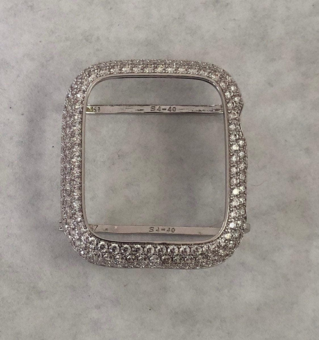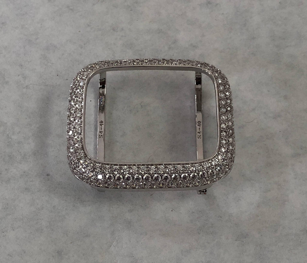 Add a Silver custom 14k white gold plated Metal Case Cover Bezel with hand set micro pave lab diamonds. Two bars on the back hold the watch in place with access to all buttons, no screen protector.
