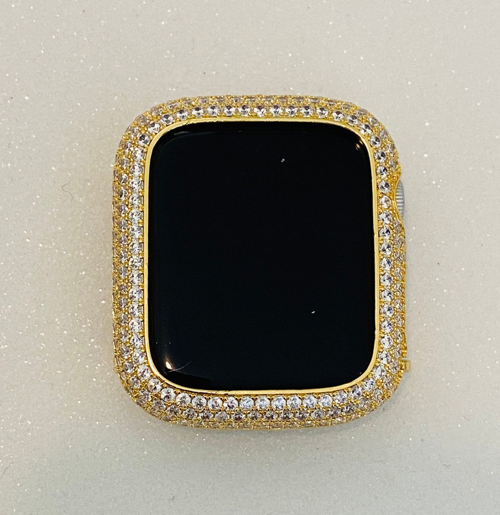 Fits the Apple Watch available for sizes 38mm 40mm 41mm 42mm 44mm 45mm 46mm Series 2-11 SE Ultra 1/2/3 Men's & Women's. Gold Apple Case Cover Only 38mm 40mm 42mm 44mm Women's or Mens Style. Custom Bezel 14k gold plated metal with hand set Micro Pave Lab Diamonds with 2 bars on the back to securely hold the watch in place with access to all buttons, no screen protector. Pretty Apple Watch Jewelry. Cover only listing, all bands can be purchased separately.