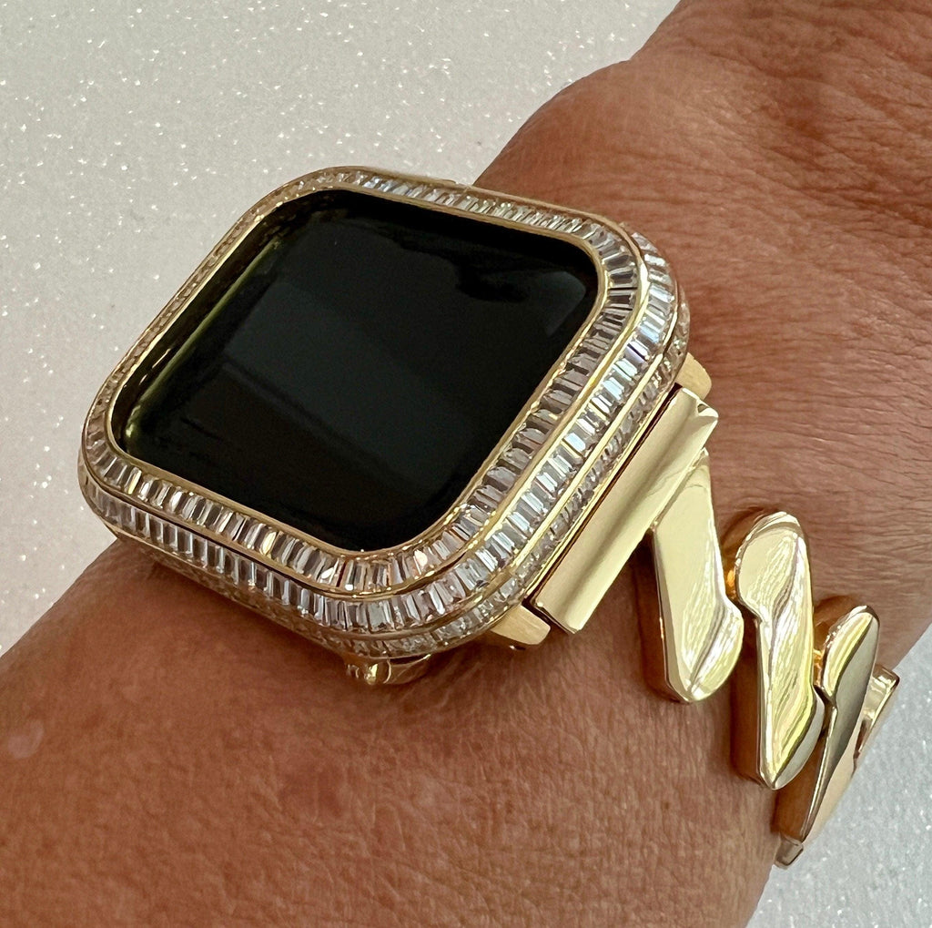 Our beaded Apple Watch Band comes with three options: the band only, band + bezel set, or bezel cover only. You can simply select your preferred option from the drop-down menus. For an extra touch of elegance, you can also add a 14k gold plated metal Apple Watch case with 3 rows of hand-set baguette lab diamonds. This case features two bars on the back to securely hold the watch in place and allows access to all buttons. Please note that this case does not come with a screen protector.