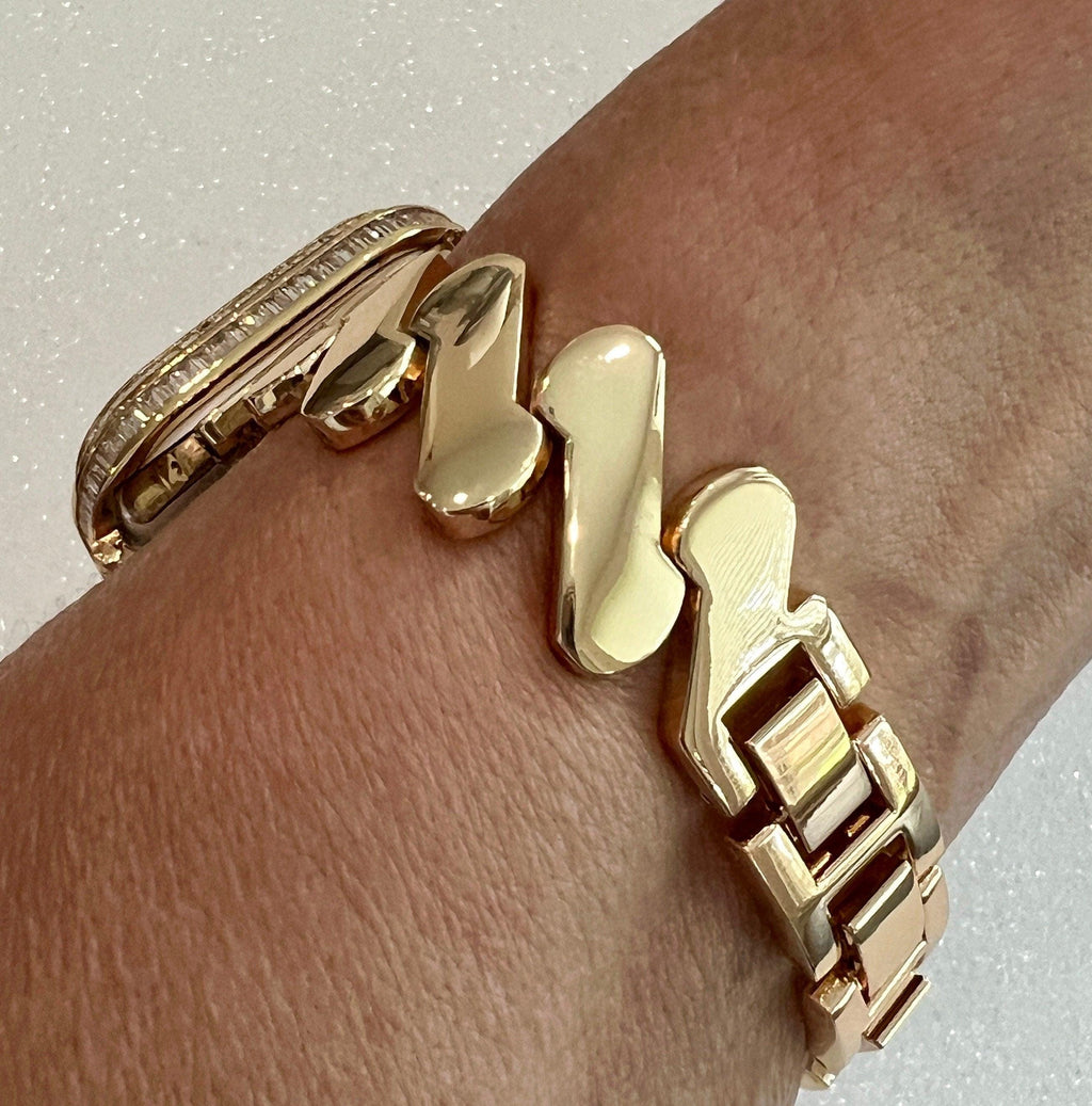 Looking for a stylish and glamorous addition to your Apple Watch? Look no further than our Minimalist Luxury Yellow Gold Z Design Apple Watch Band! This band is specially made to fit Apple Watches in sizes 40mm, 41mm, 44mm, 45mm, Series 4-9 SE. Made of a Yellow Gold Alloy for durability with fold over removable clasps.