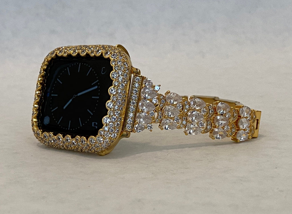 Fits Apple Watch in sizes 38mm 40mm 42mm 41mm 44mm 45mm 46mm Series 2-11 SE. 49mm Ultra 1/2/3 (see photo labeled 49mm-slightly different due to watch design) . This is a Luxury Custom Apple Watch Band with Pear shaped High End Swarovski Crystals set in a high polish yellow gold plated band, Add the 14K Gold Plated Apple Watch Case Cover with Pave lab diamonds.