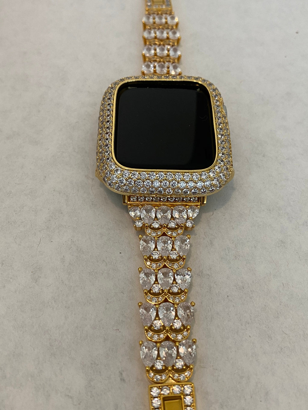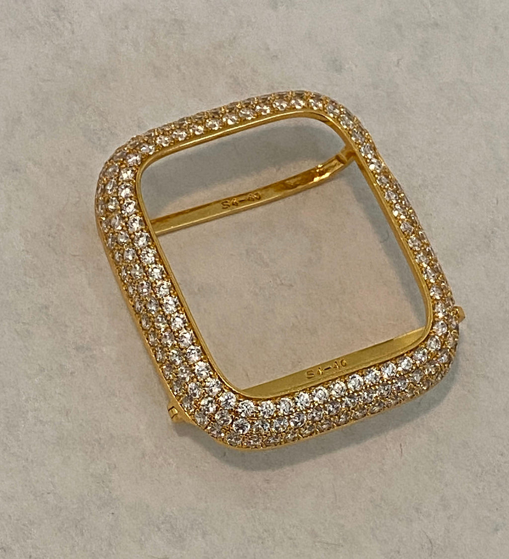 Apple Watch Case Materials: 14kt gold plating over a metal base with hand set pave lab created diamonds. Two bars on the back hold the Apple Watch in place with access to all buttons. There is NO screen protector. Instructions Included.