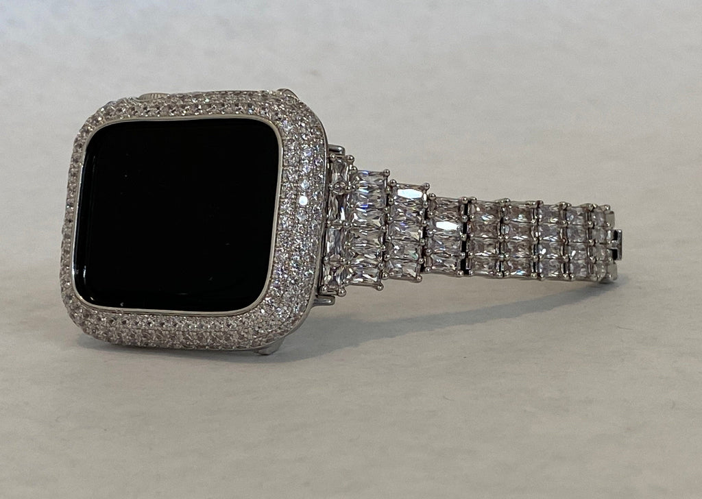 Introducing our beautifully crafted Designer Apple Watch Band, Fits Apple Watch in sizes 38mm 40mm 42mm 41mm 44mm 45mm 46mm Series 2-11 SE. 49mm Ultra 1/2/3Apple Watch. This band features a stunning silver plated design, adorned with exquisite hand-set High End Swarovski Crystal Baguette stones for an added touch of sophistication and elegance.