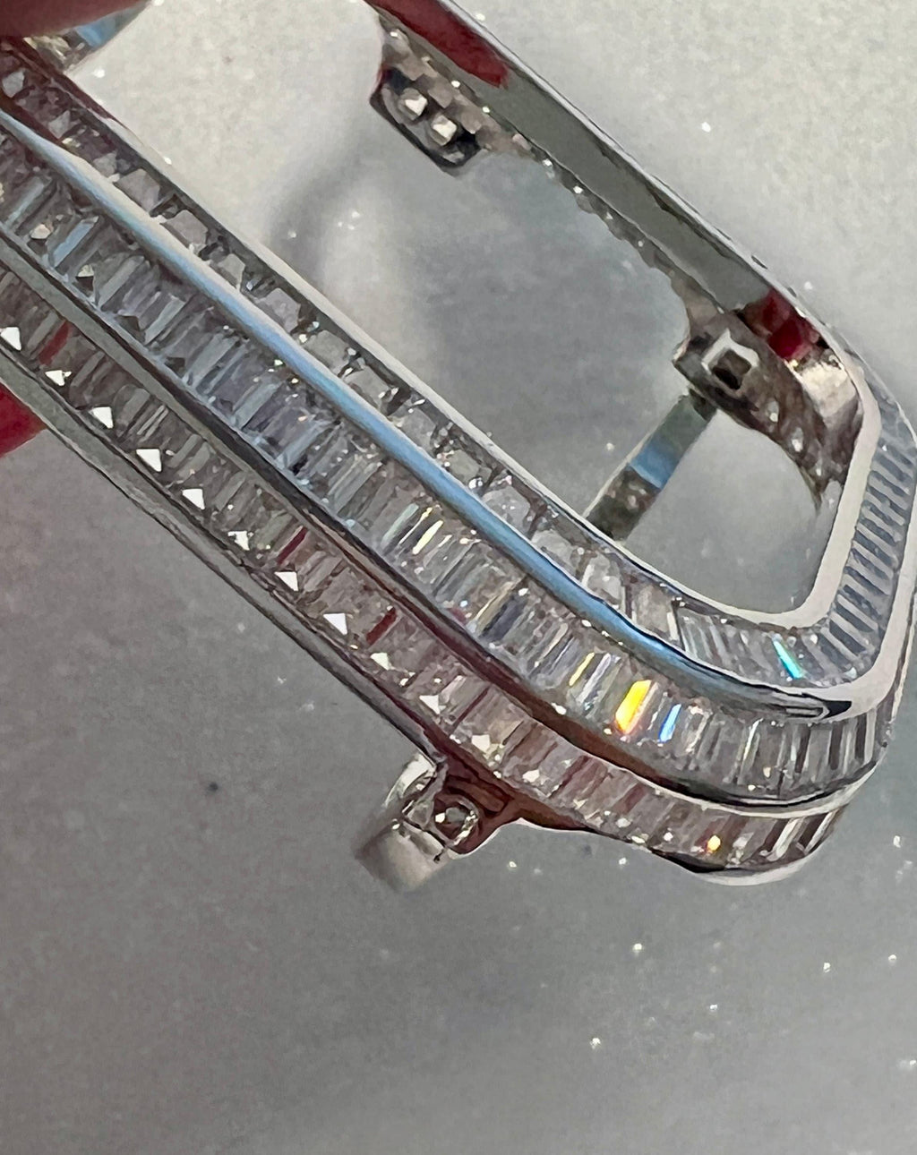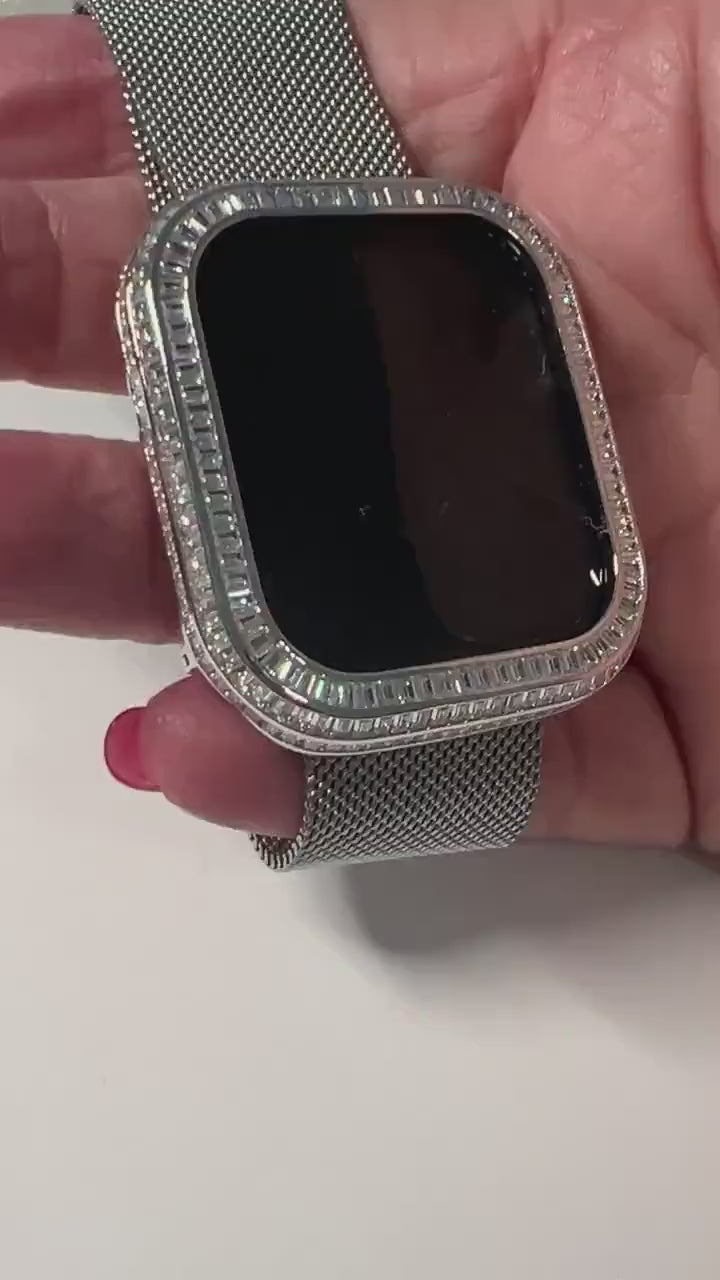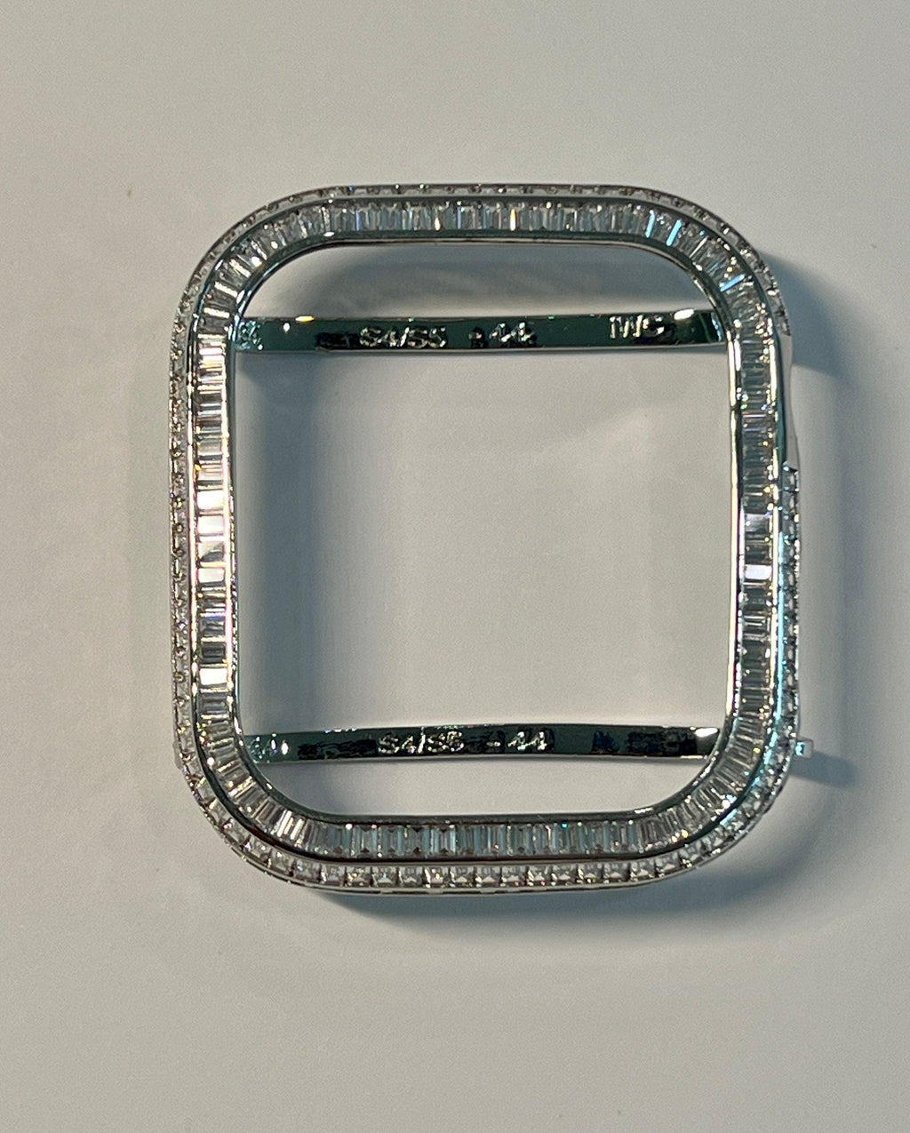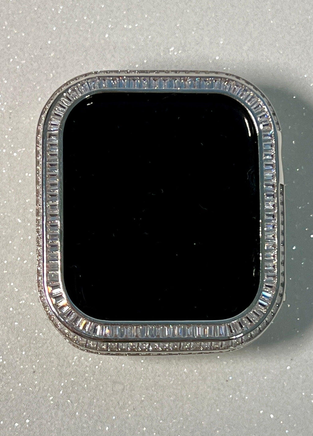 Fits the Apple Watch available for sizes 40mm 41mm 44mm 45mm Series 4-9 SE. Custom Apple Watch Bezel Cover with 3 gleaming rows of high quality handes lab diamond baguettes set in 14k white gold plated metal case.