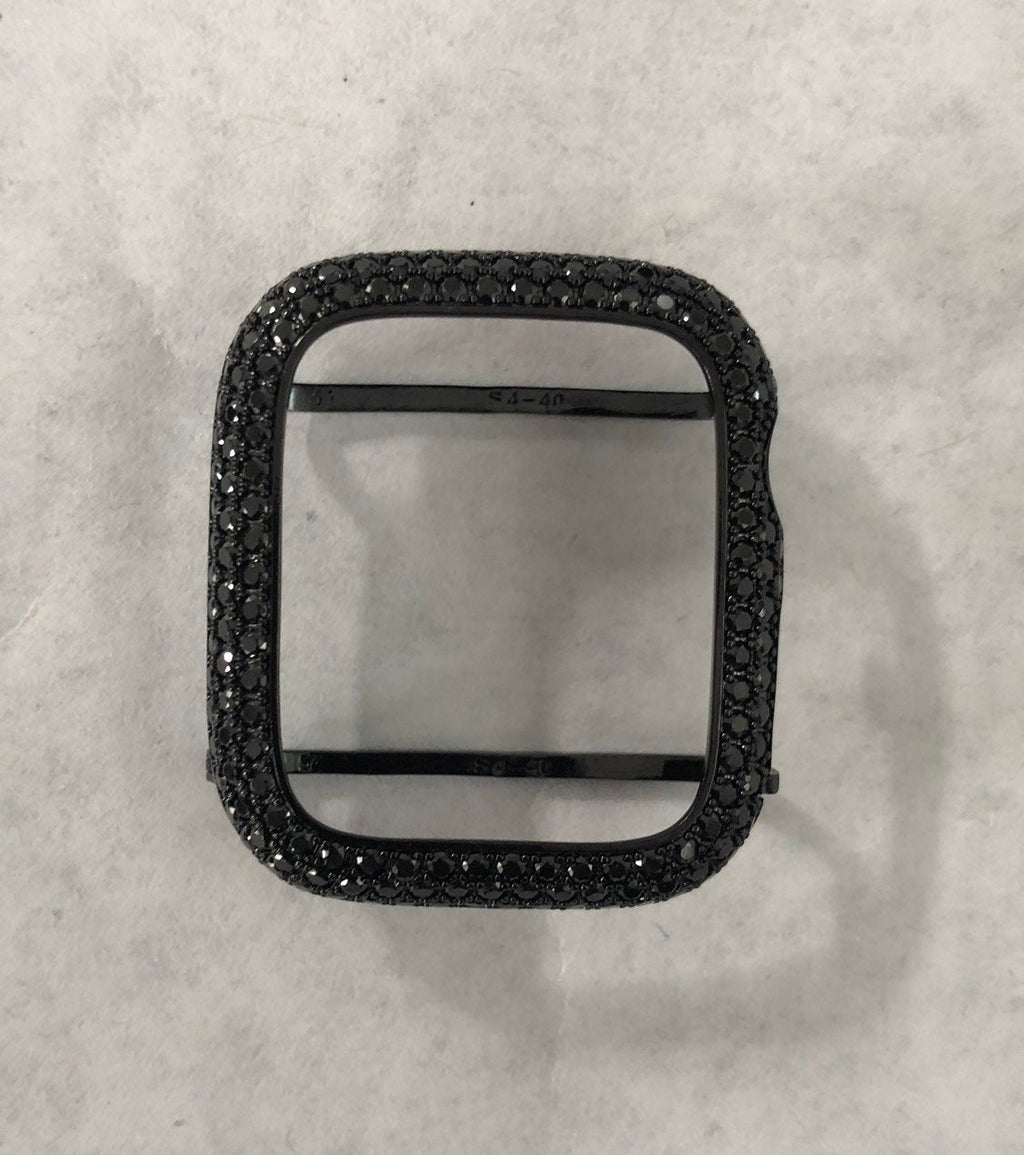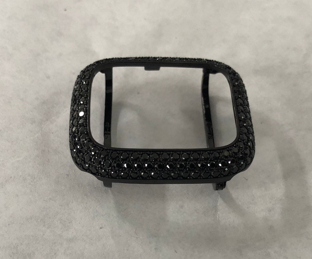 Upgrade your Apple Watch with our Designer Black on Black Apple Watch Case Bezel Cover from Smartwatch Lab. This bezel cover Fits the Apple Watch available for sizes 38mm 40mm 41mm 42mm 44mm 45mm 46mm Series 2-11 SE Ultra 1/2/3 Men's & Women's. Made with high-quality materials, this bezel cover features a custom black rhodium plated bezel and lab grown diamonds in a micro pave setting. It adds a touch of elegance to your Apple Watch, making it the perfect jewelry accessory.