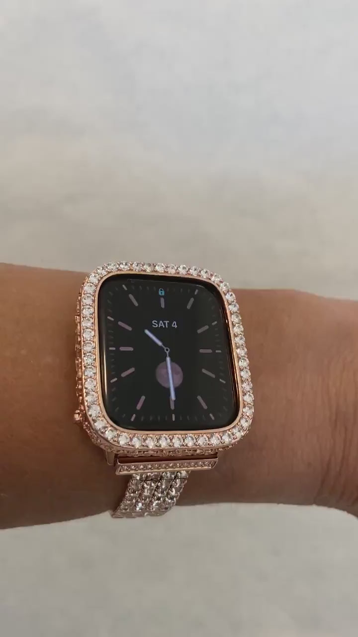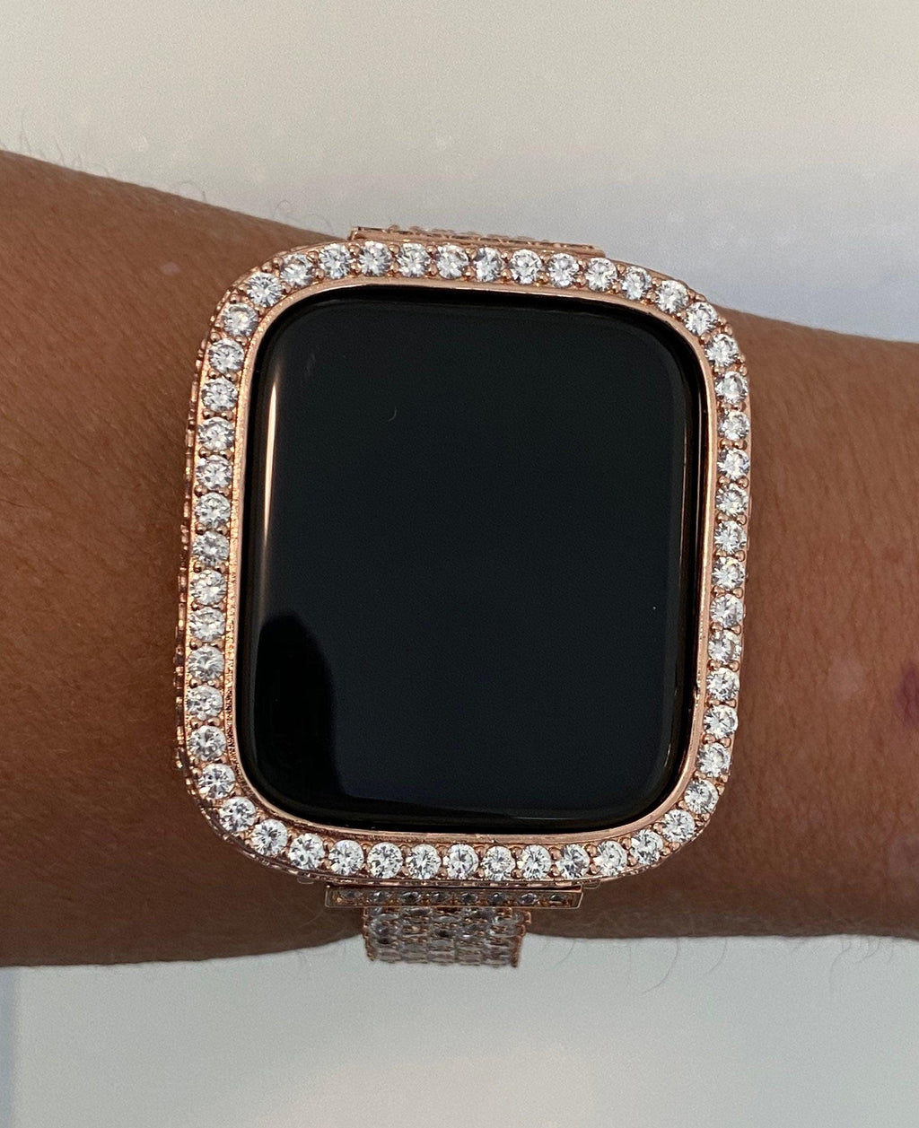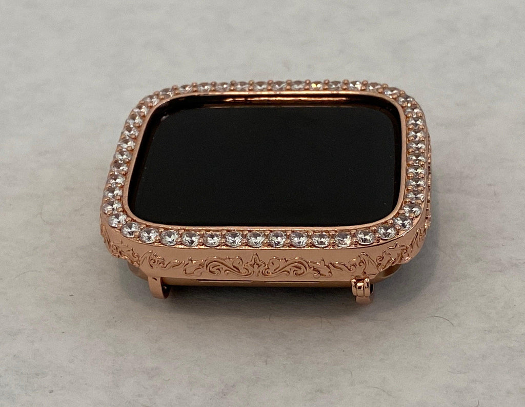 Apple Watch Series 9 41mm or 45mm same size as Series 7/8 (use that selection) and 49mm Ultra 1 (use that selection) or 2 same size. Custom Apple Watch Bezel Case Cover in 38mm 40mm 42mm 44mm Bezel Rose Gold For Apple Watch Band Bling 2.5 Lab Diamonds around the face with elegant engraving around the sides. . Listing is for bezel only, band in photo and video is not included.