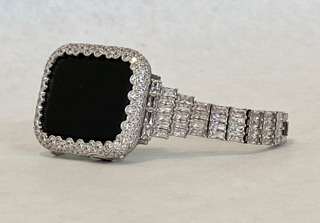 This beautiful Custom Apple watch band is high on the bling with a silver Alloy plated band for extra durability ad shine, that features rows of high quality Large Baguette Swarovski Crystals. For the ultimate in sparkle, add the matching Silver 14K White Gold Plated Pave Lab Diamond Bezel Cover. Fits wrist sizes from 5.75" to 8'. Easy to resize with fold over clasps. Does not require a tool.