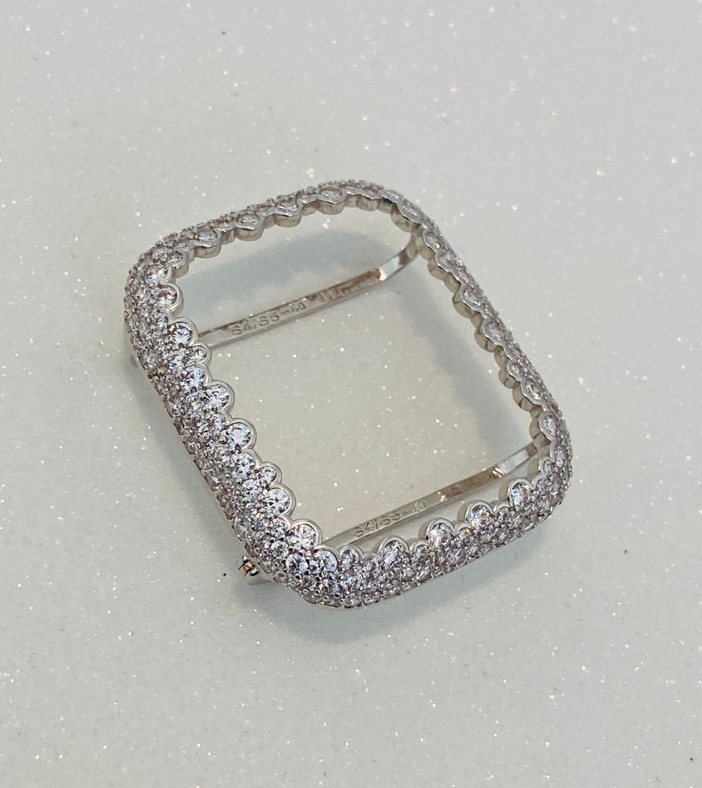 Add the 14k White Gold Plated Apple Watch Cover with pave lab diamonds, this apple watch case has two bars on the back that hold the watch firmly in place with access to all buttons, there is no screen protector. Does not fit the all ceramic white apple watch.