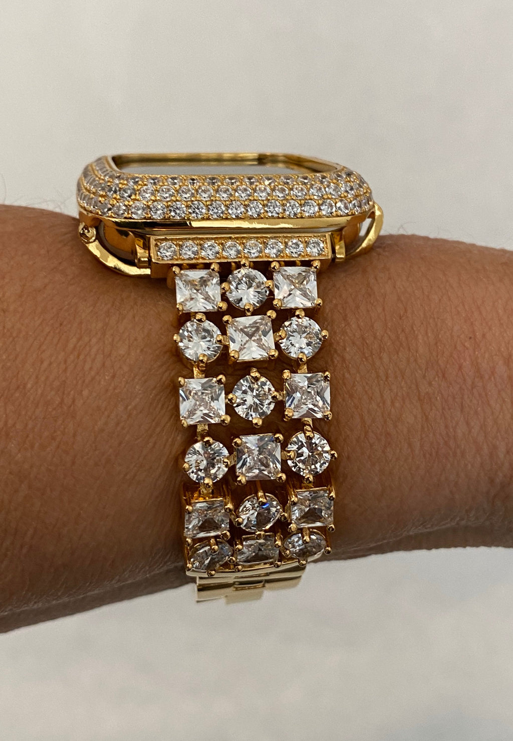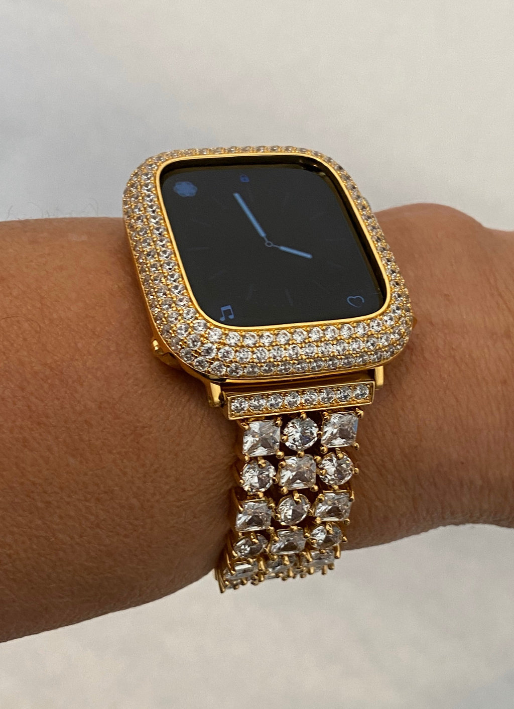 Materials: Swarovski Crystals apple band, lab diamonds apple case, 14k gold plating apple case, yellow gold alloy plating apple band.