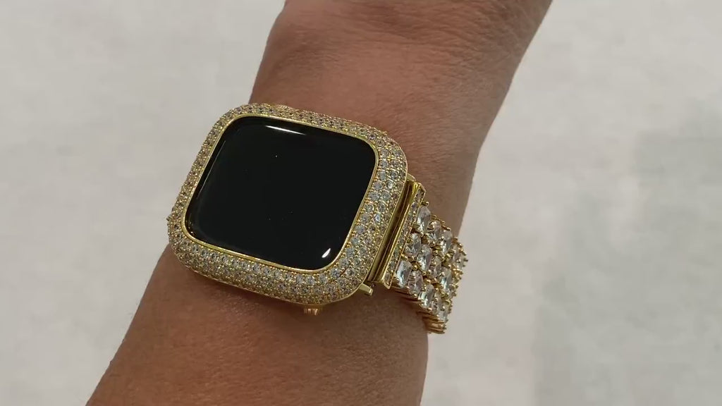Apple Watch Case Materials: 14kt gold plating over a metal base with hand set pave lab created diamonds. Two bars on the back hold the Apple Watch in place with access to all buttons. There is NO screen protector. Instructions Included.