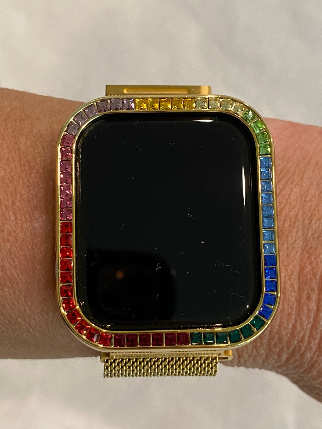 Enhance the look of your Apple Watch with our Gold Apple Watch Cover High End Crystal Rainbow Apple Watch Case Smartwatch Bumper Bling! This high-quality cover is designed to fit the Apple Watch in sizes 38, 40, 42, and 44mm for series 2, 3, 4, 5, 6, or SE models.