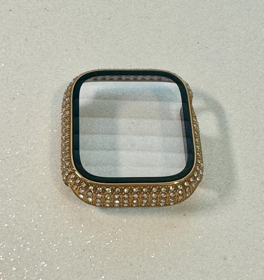 Apple Watch Case Materials: This yellow gold case is studded with Swarovski Crystals set in a gold metallic poly carbonate frame with a tempered glass screen protector. Snap on style with access to all buttons. This is not a metal case.