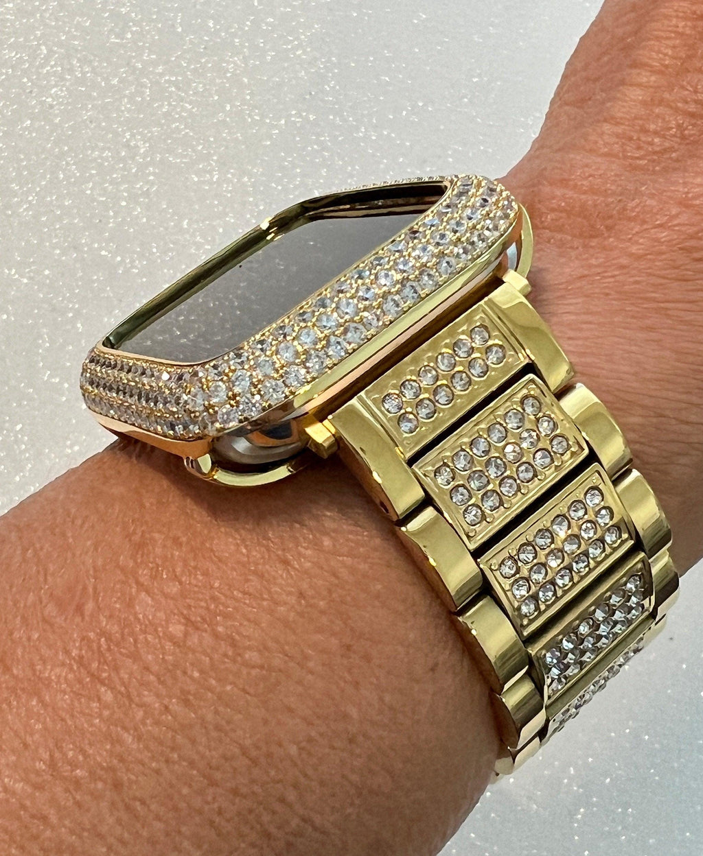 Apple Watch Case Materials: 14kt yellow gold plating over a metal base with hand set pave lab created diamonds. Two bars on the back hold the Apple Watch in place with access to all buttons. There is NO screen protector. Instructions Included.
