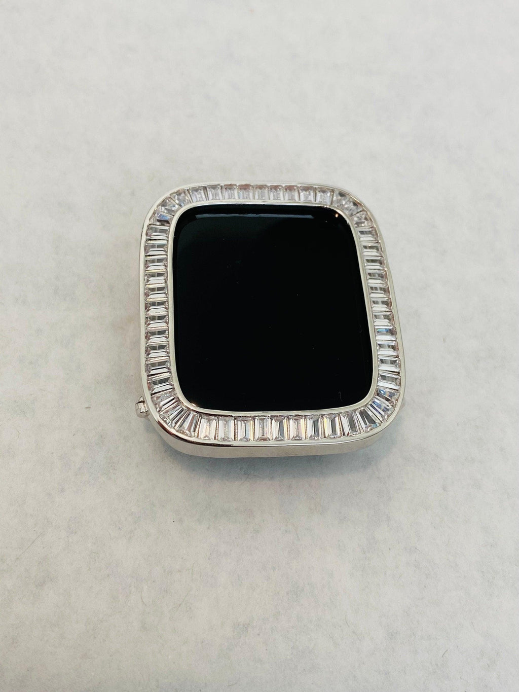 Fits the Apple Watch available for sizes 38mm 40mm 41mm 42mm 44mm 45mm Series 2-9 SE Men's & Women's. This is a custom design made to fit the Apple Watch, it is not a brand copy. This beautiful Custom Apple watch band is high on the bling with a silver band that features rows of high quality Large Baguette stones. The band is plated in a silver metal alloy for extra shine and durability. For the ultimate in sparkle, add the matching Silver 14K White Gold Plated Apple Watch Case with Baguette Lab Diamonds. The apple watch band fits wrist sizes from 5.75" to 8" and has easy to remove fold over clasps for resizing, no tool required.
