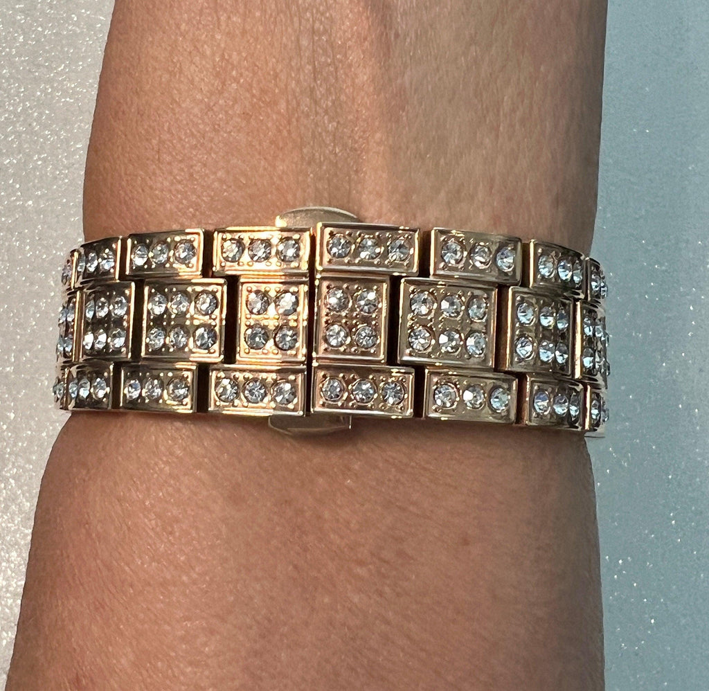 Fits the Apple Watch size 38mm 40mm 41mm 42mm 44mm 45mm Series 2-9 SE. Men's or Women's style custom Apple Watch Band Rose Gold Stainless Steel with large High End Crystals & or Rose Gold Lab Diamond Bezel Cover set in 14k rose gold plated metal frame. It is high on the bling with a silver stainless steel band that features large High End Crystals and a butterfly buckle closure.