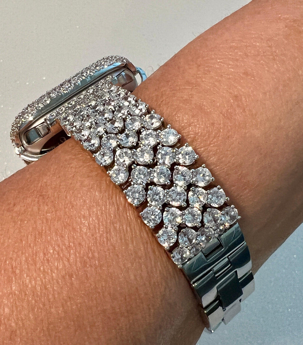 Introducing our beautifully crafted Designer Apple Watch Band, Fits Apple Watch in sizes 38mm 40mm 42mm 41mm 44mm 45mm 46mm Series 2-11 SE. 49mm Ultra 1/2/3. Please note that the 49mm size may slightly differ due to the watch design, as shown in the last photo. This band features a stunning silver plated design, adorned with exquisite large hand-set round fully faceted lab diamond stones for an added touch of sophistication and elegance.
