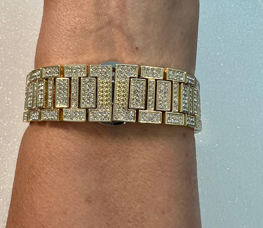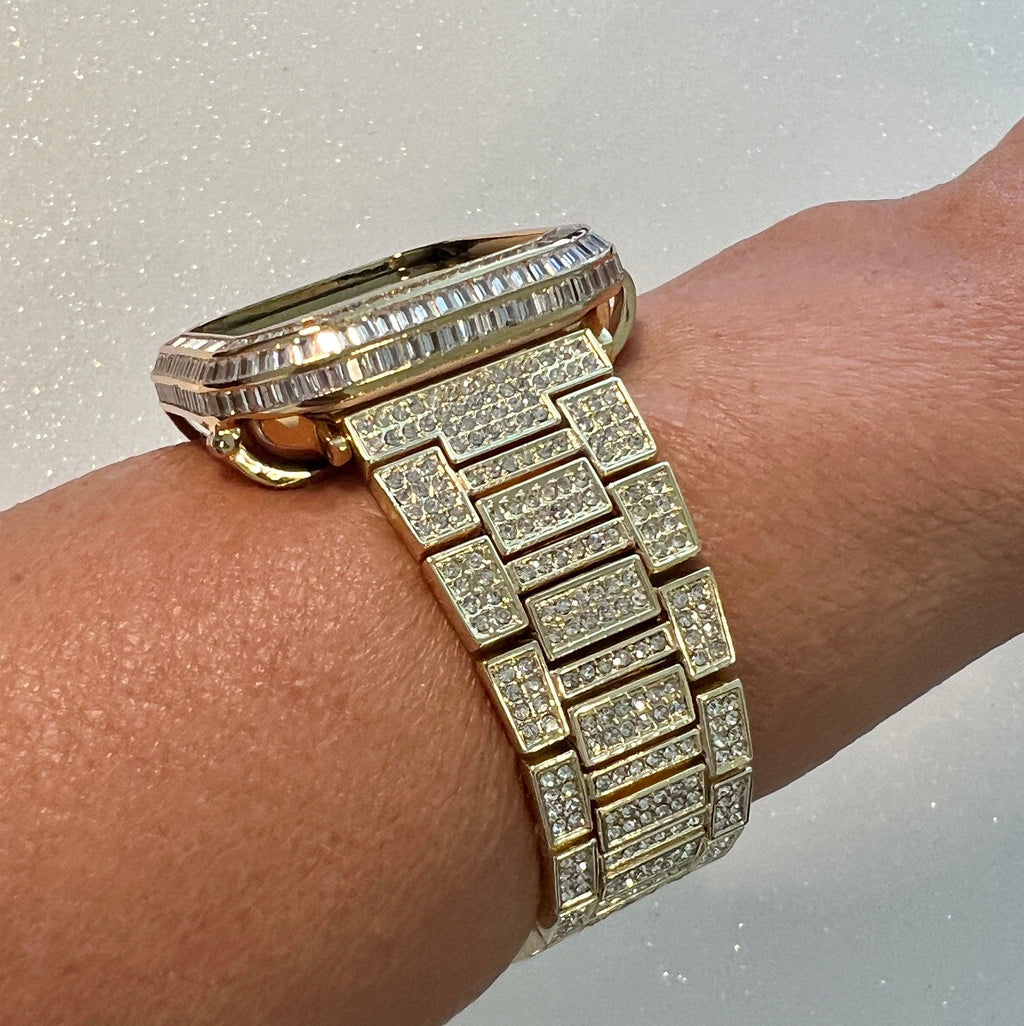 Luxury Apple Watch Band Yellow Gold Pave High End Crystals & or Apple Watch Case Lab Diamond Bezel Cover Smartwatch Bumper Bling from Iwatch Candy. Fits the Apple Watch available for sizes 40mm 41mm 44mm 45mm Series 4,5,6,7,8,9 SE Men's & Women's. This is a custom design made to fit the Apple Watch, it is not a brand copy. This beautiful Apple Watch Band is high on bling with a yellow gold stainless steel band with pave High End Swarovski Crystals with a butterfly buckle style closure. This apple watch band can be resized to fit wrist size 5.75" to 8". Comes with resizing tool and instructions.