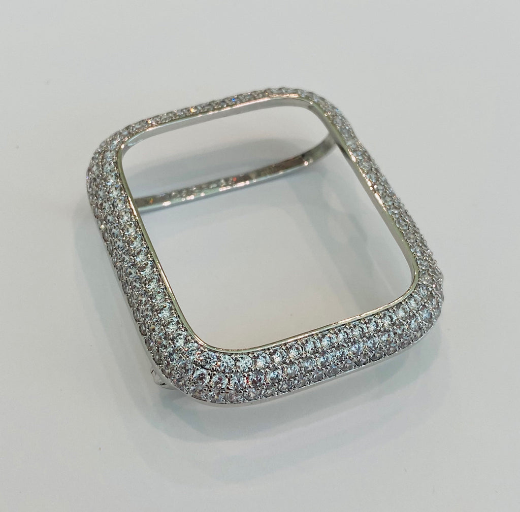Our band is easy to resize with the included tool and instructions, and is available as a complete set with the band and bezel, just the band, or just the bezel cover. For even more shine, add our Silver Apple Watch Case in 14K White Gold Plated Metal, featuring hand set Pave Lab Diamonds. Please note that our bezel covers will not fit properly with any type of screen protector, including liquid glass. These bezels are specifically designed to fit the Apple Watch without any alterations.