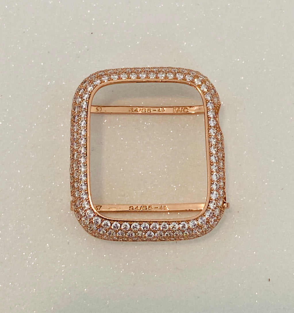 Apple Watch Case Materials: 14kt rose gold plating over a metal base with hand set pave lab created diamonds. Two bars on the back hold the Apple Watch in place with access to all buttons. There is NO screen protector. Instructions Included.