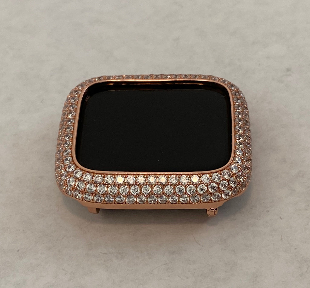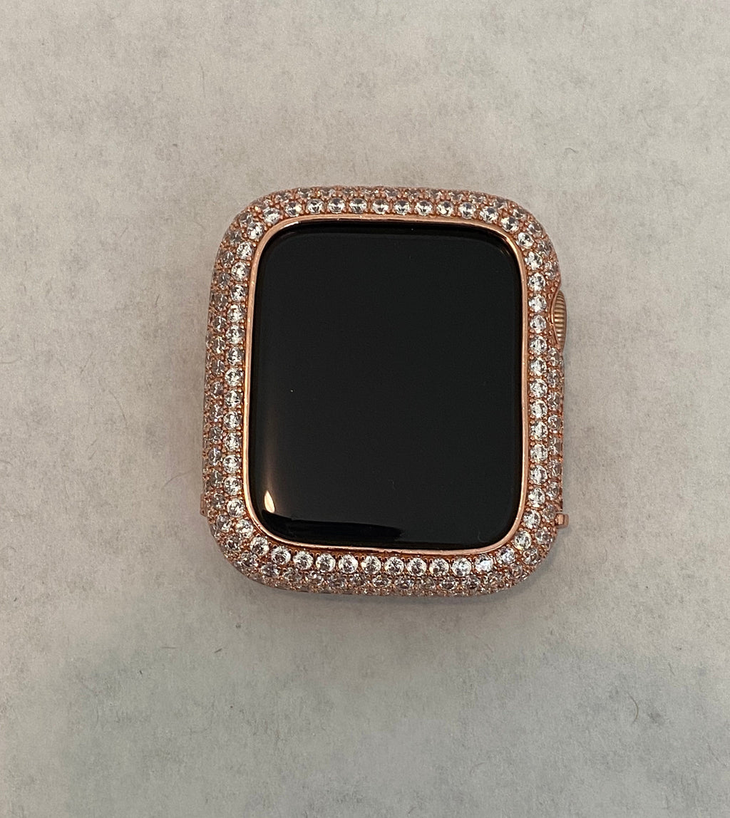 Apple Watch Case Materials: 14kt Rose gold plating over a metal base with hand set pave lab created diamonds. Two bars on the back hold the Apple Watch in place with access to all buttons. There is NO screen protector. Instructions Included.