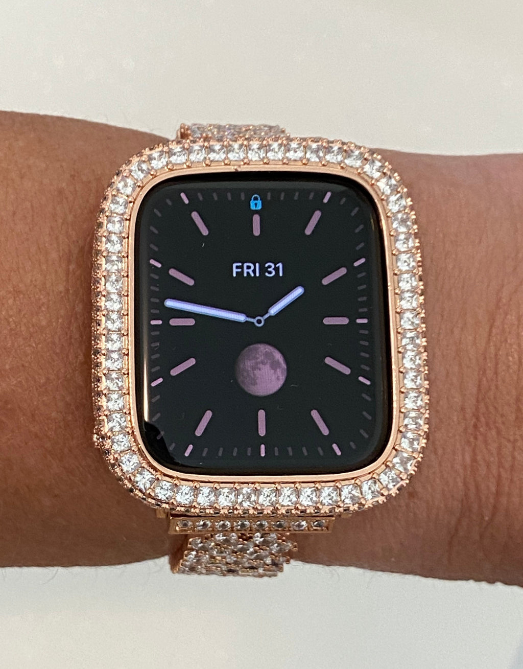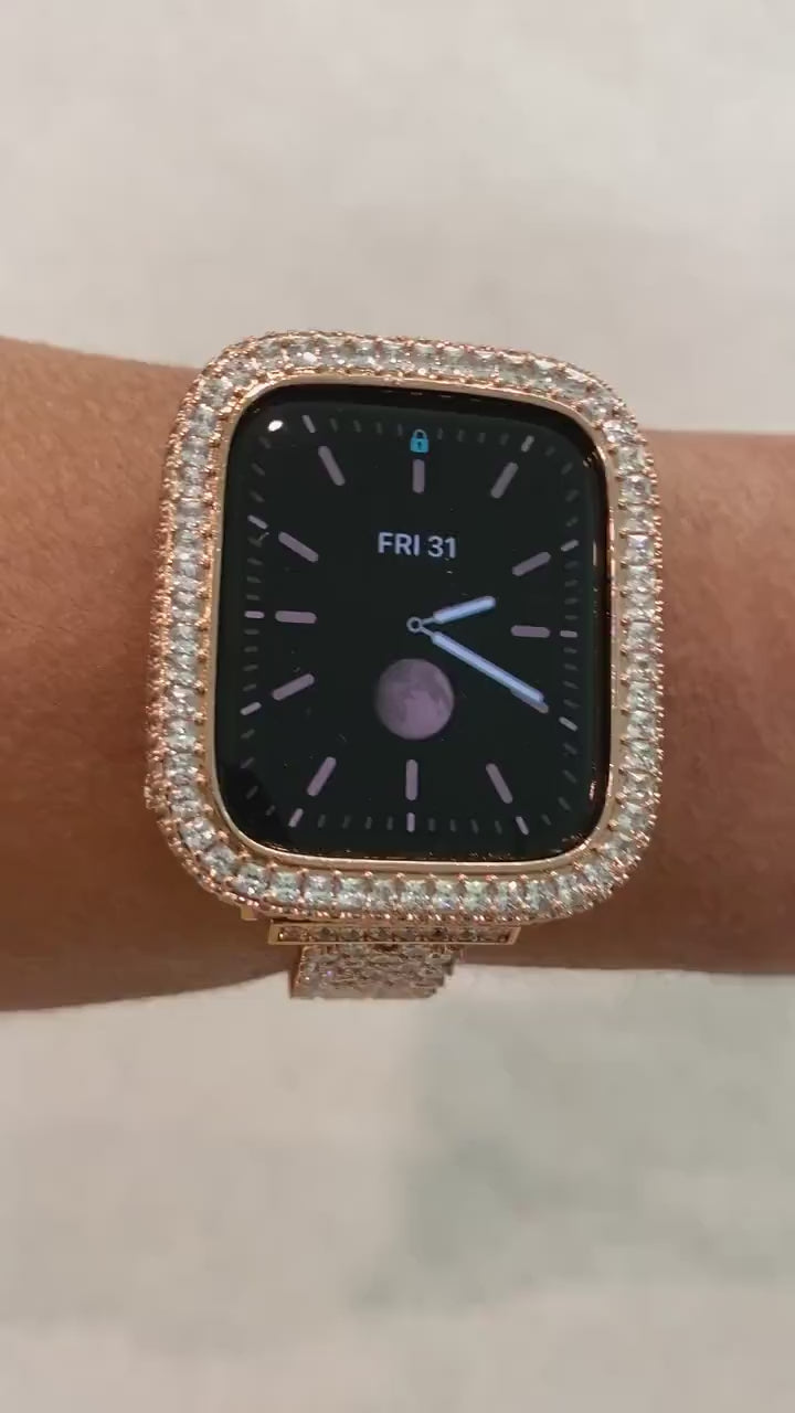 Fits the Apple Watch available for sizes 40mm and 44mm in series 4,5,6 or SE Men's & Women's. Custom Apple Watch Bezel Cover with 2.5 square Lab Diamonds on the face and micro pave style on the sides. So Pretty Apple Watch Case Jewelry. Band in photos or video is not included.