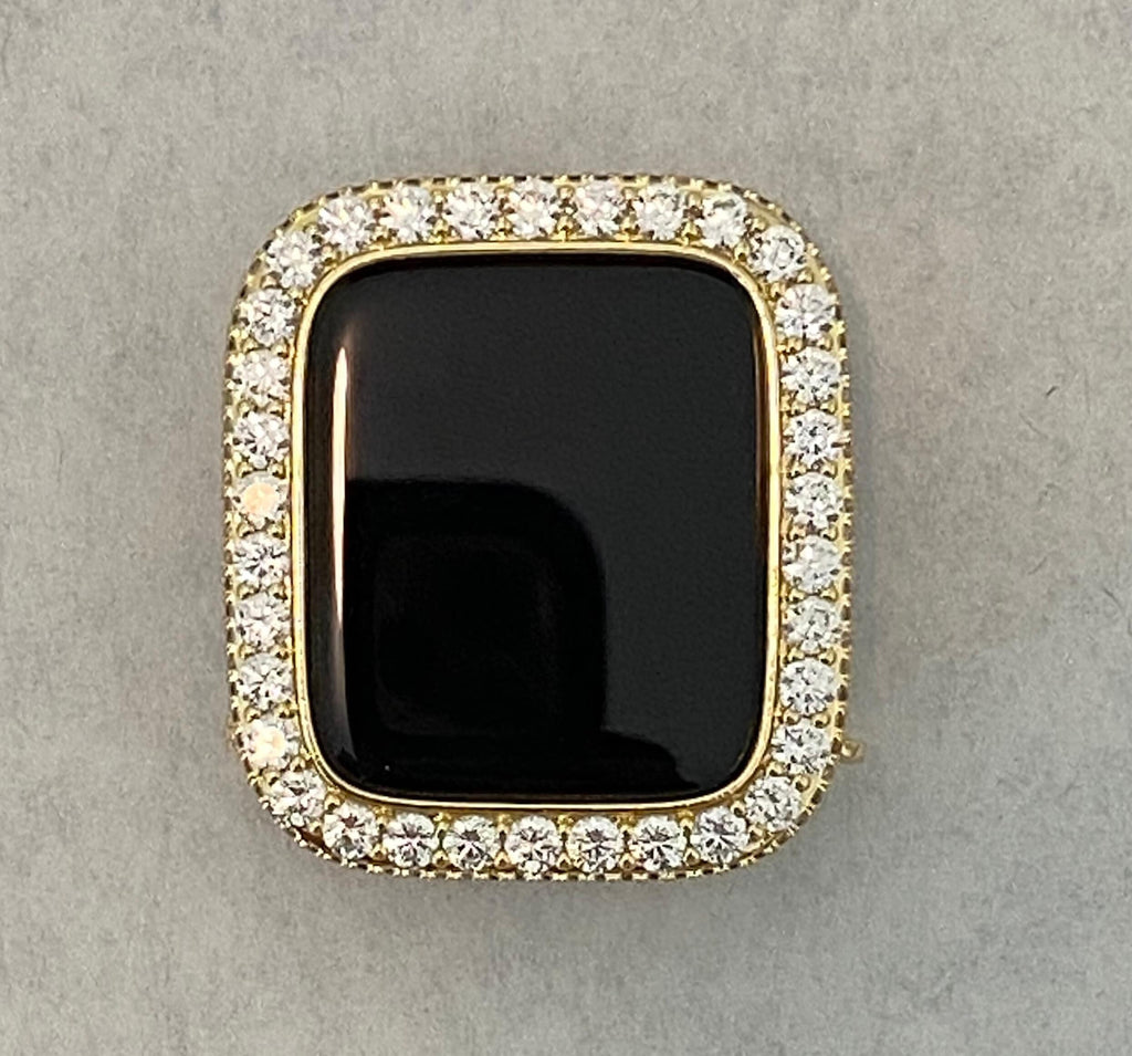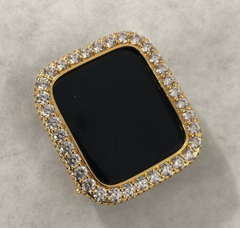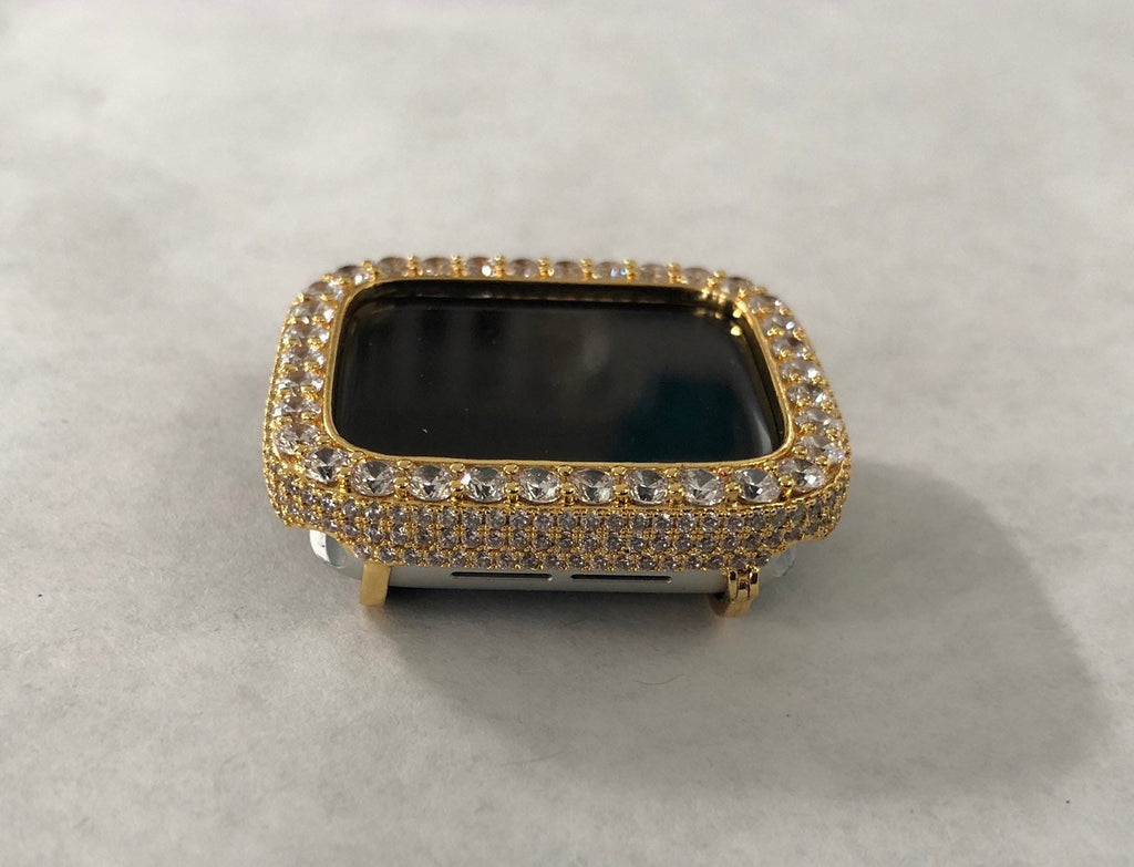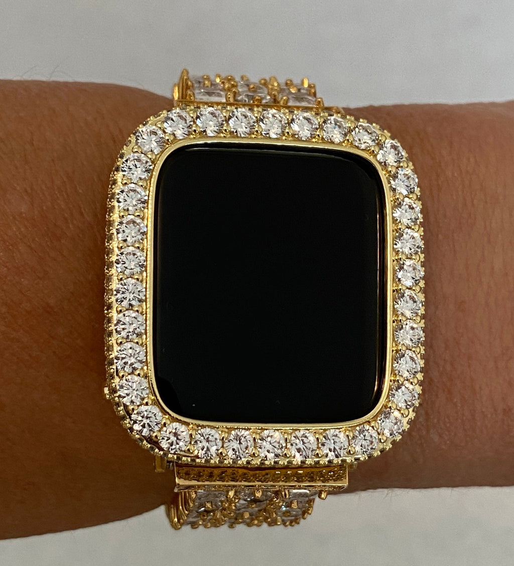 Apple Watch Series 9 41mm or 45mm same size as Series 7/8 (use that selection) and 49mm Ultra 1 (use that selection) or 2 same size. Fits the Apple Watch available for sizes 38mm, 42mm 41mm or 45mm in series 1-8 SE. Men's & Women's. Gold Apple Watch Cover with Large 3.5mm lab diamonds around the face and micro pave lab diamonds on the sides. Iwatch Case Cover is Metal plated 14k Gold with Huge Sparkle and Bling. Photos just don't do this bezel justice...mega sparkle. Listing is for bezel only, band in photo or video is not included.