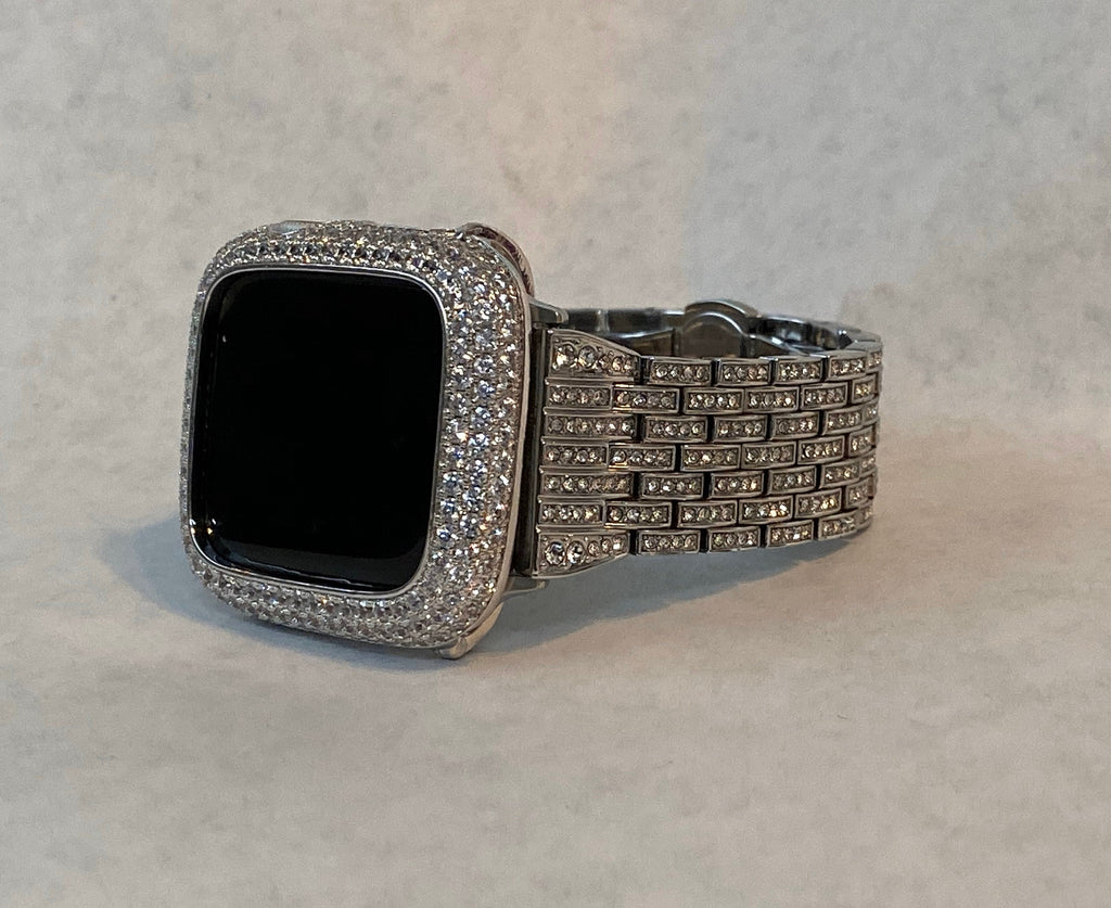 Series 10-11 Apple Watch Band Silver Stainless Steel Swarovski Crystals & or Apple Watch Case Lab Diamond Bezel Bling Iphone Watch Cover
