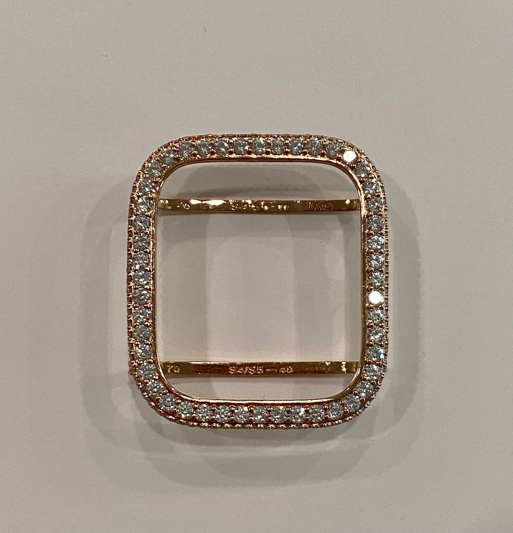 Introducing our stunning Rose Gold Apple Watch Bezel, custom plated in 14k rose gold and adorned with high quality lab diamonds. This bezel is designed to fit the Apple Watch in sizes 38mm 40mm 41mm 42mm 44mm 45mm 46mm Series 2-11 SE Ultra 1/2/3 Men's & Women's