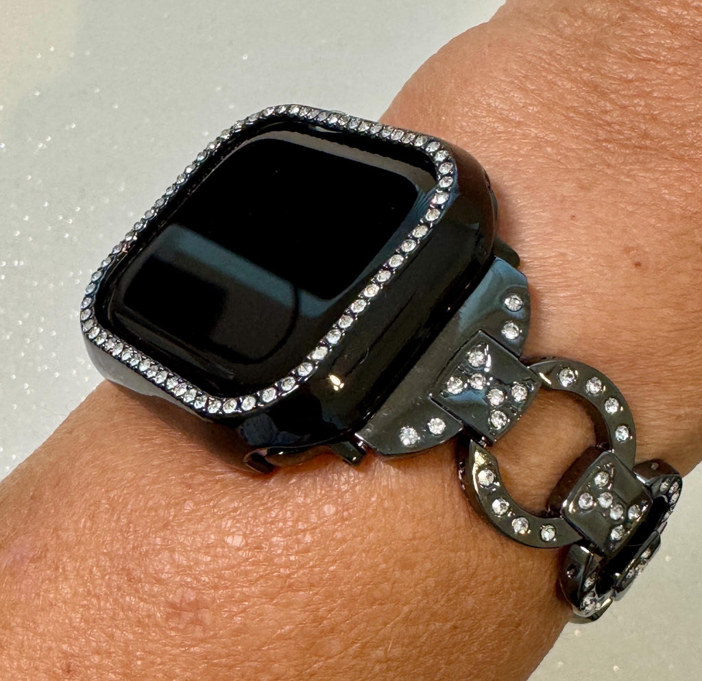 Luxury Custom Black Rhodium Plated Watch band sparkling pave Swarovski Crystals & or Apple Watch Cover with 1 rows of High End Swarovski Crystals set in a metallic black poly carbonate hard frame. This case is not metal. There is no screen protector. So pretty and elegant, photos don't capture the amount of sparkle.