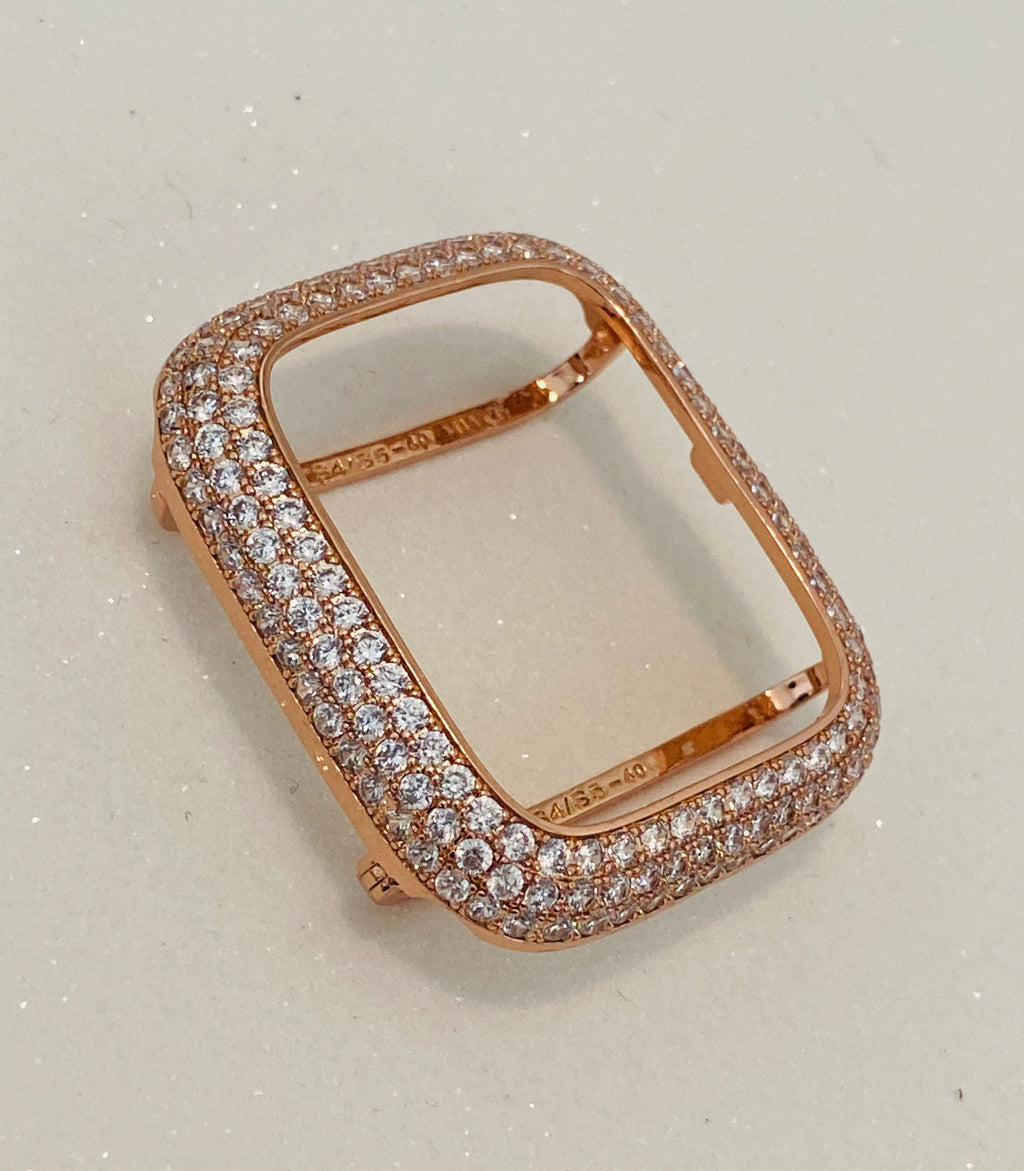Apple Watch Case Materials: 14kt rose gold plating over a metal base with hand set pave lab created diamonds. Two bars on the back hold the Apple Watch in place with access to all buttons. There is NO screen protector. Instructions Included.