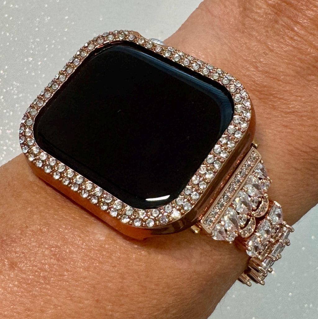Materials: Swarovski Crystals apple band or case, rose gold alloy plating apple band, poly carbonate case.