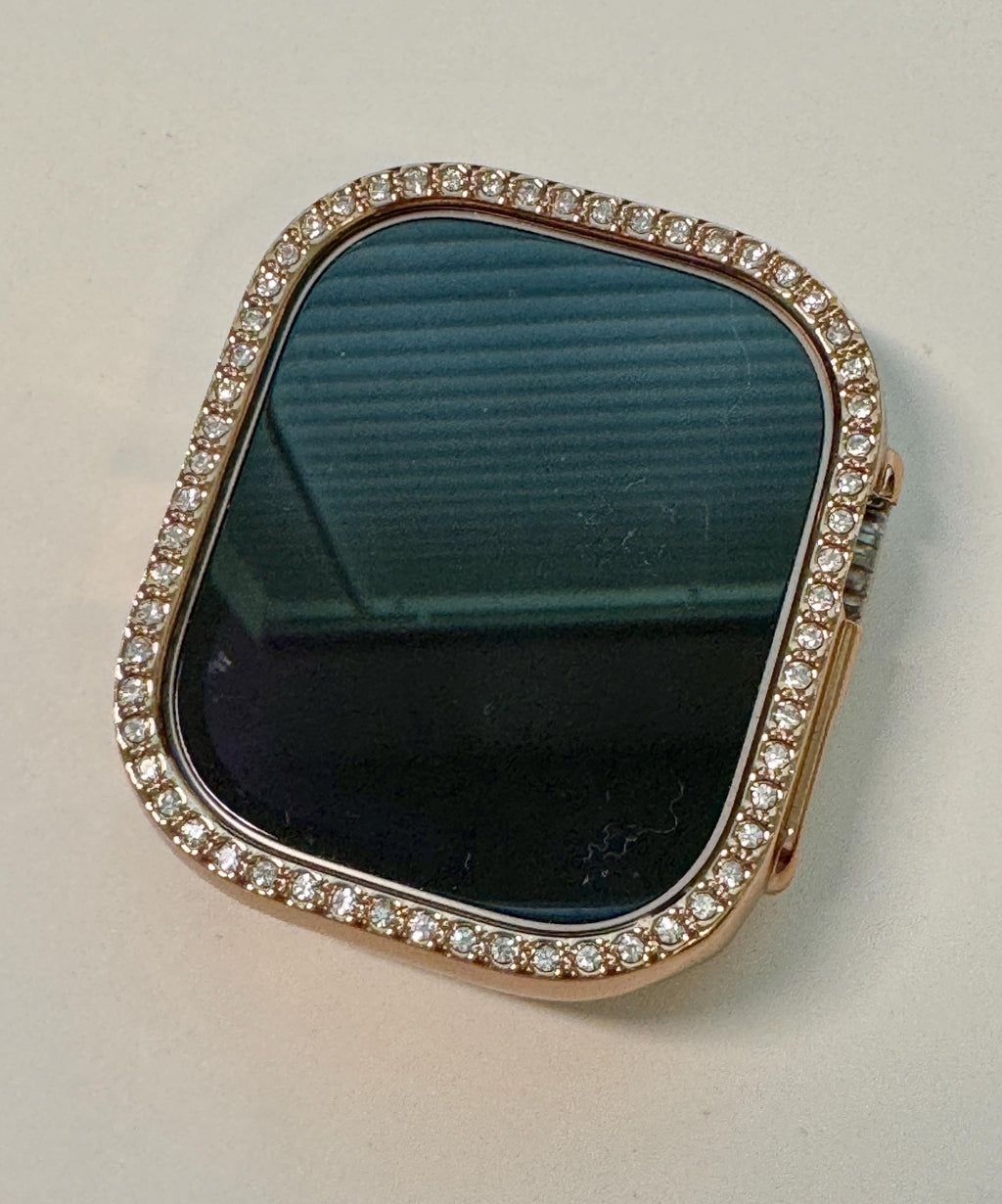 Add the Rose Gold Apple Watch Case with 2 rows of Swarovski Crystals set in a high polish poly carbonate frame in a snap on design. Access to all button, where vary based on the watch size and series.