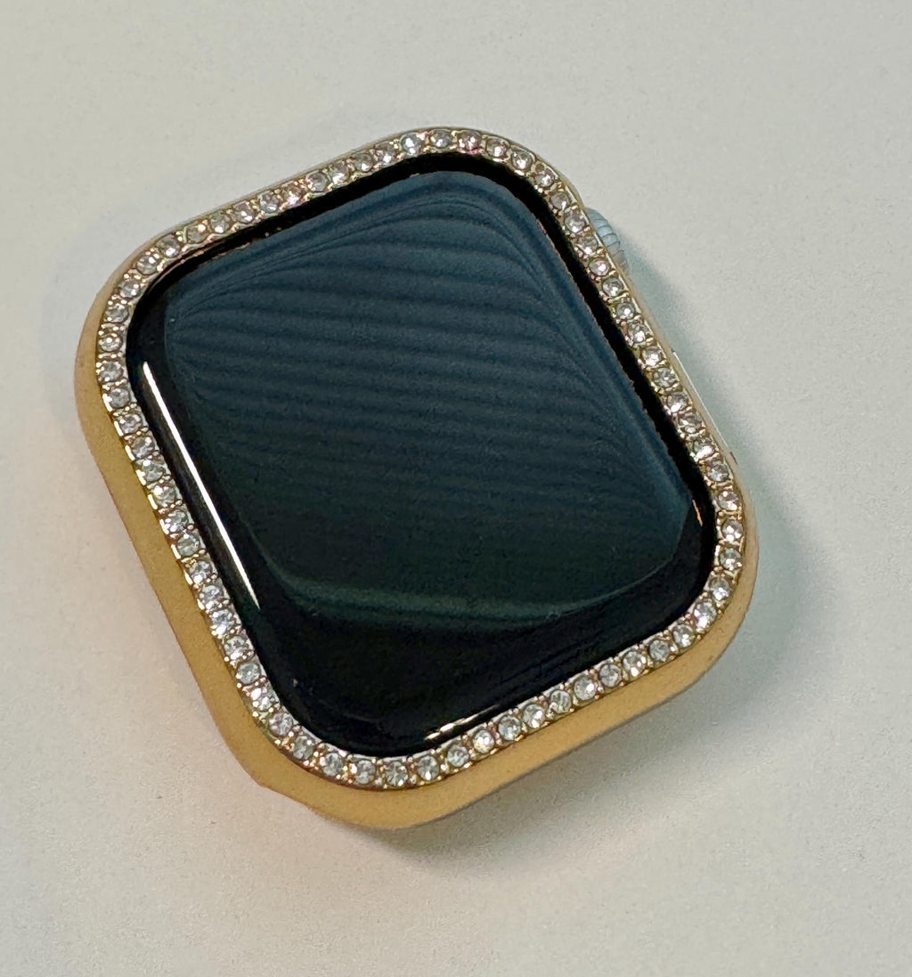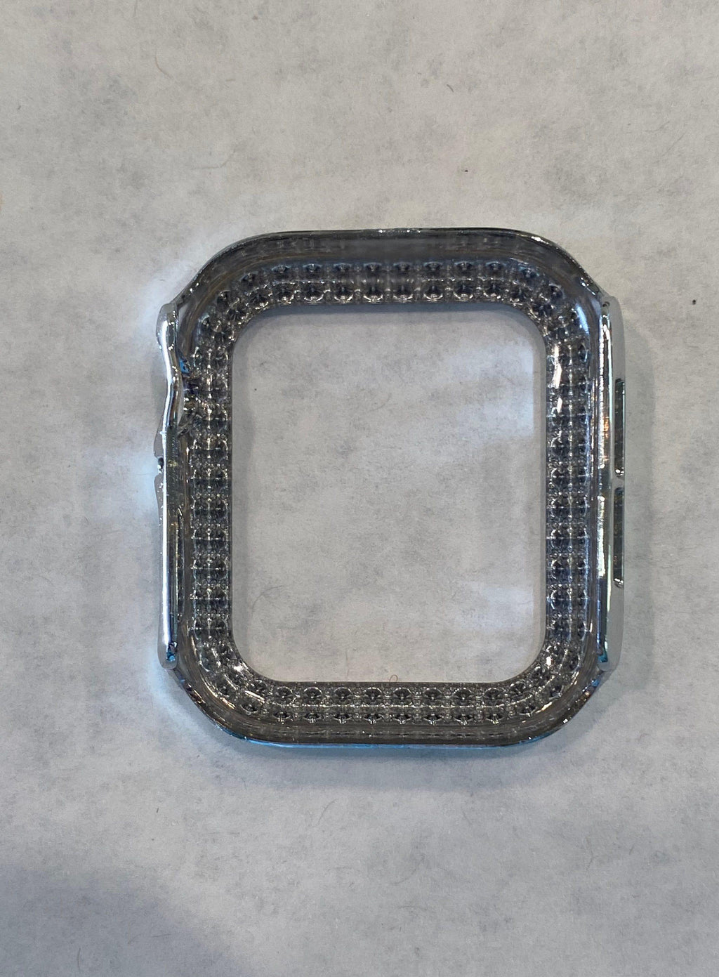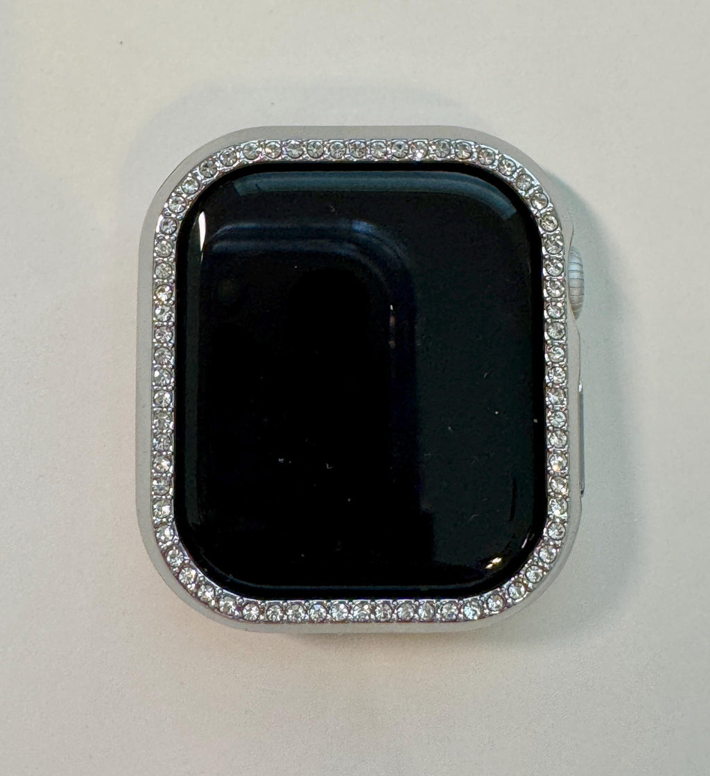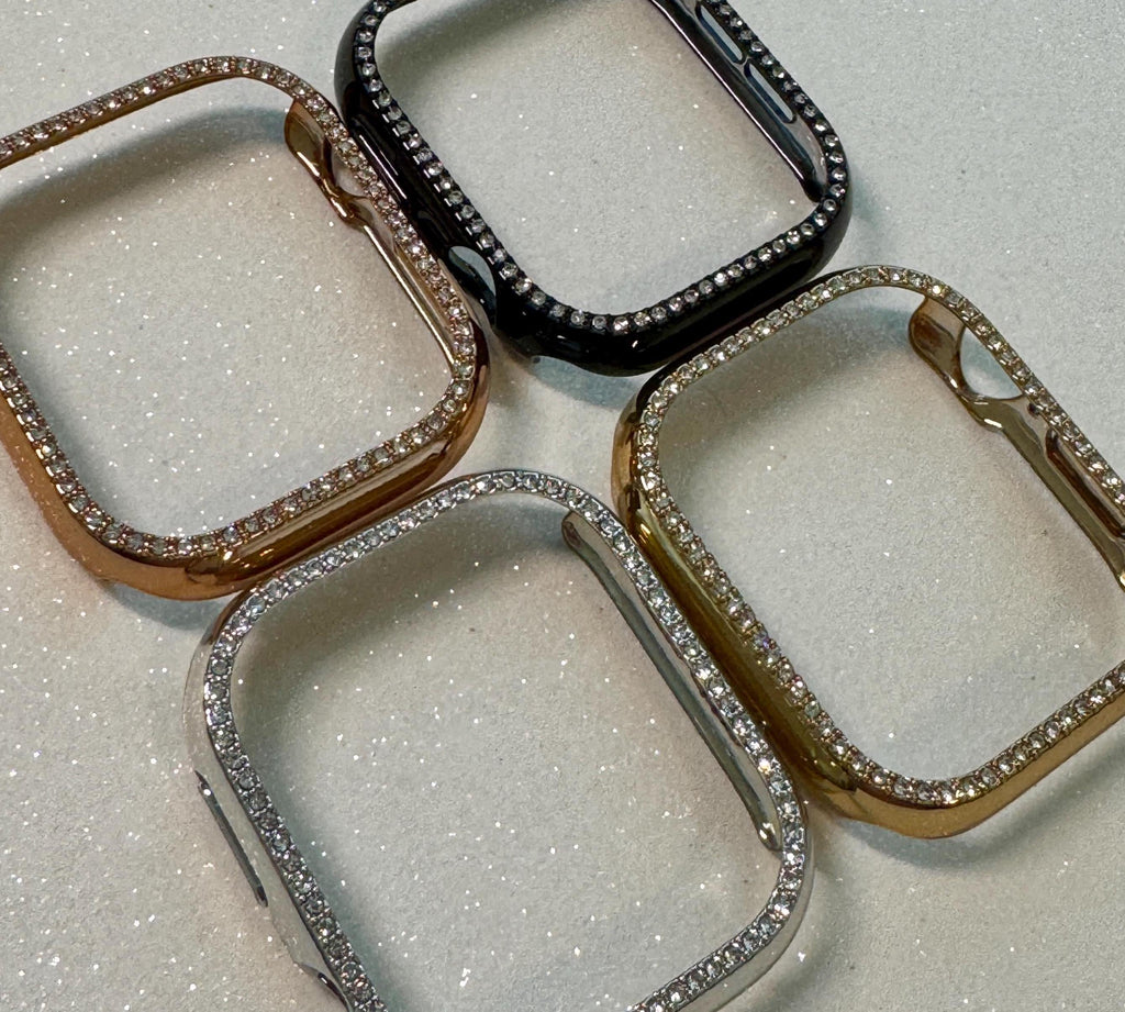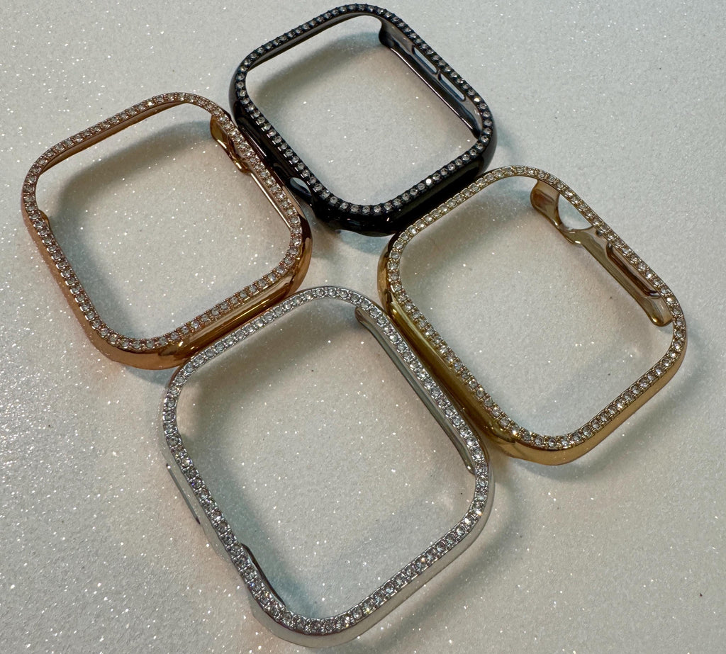 Fits the Apple Watch in sizes 41mm 45mm Series 7/8/9, 42mm 46mm Series 10, 49mm Ultra Series 1/2. This Apple Watch Case Cover features 1 row of large High End Swarovski Crystals set in a polished metallic poly carbonate hard frame. Your choice of colors, silver, rose gold, yellow gold and black. This hard frame resists scratches, wear and tear. Easy snap on style with access to all buttons. There is no plastic screen and it is not made of metal. Buttons holes vary based on watch size and series.