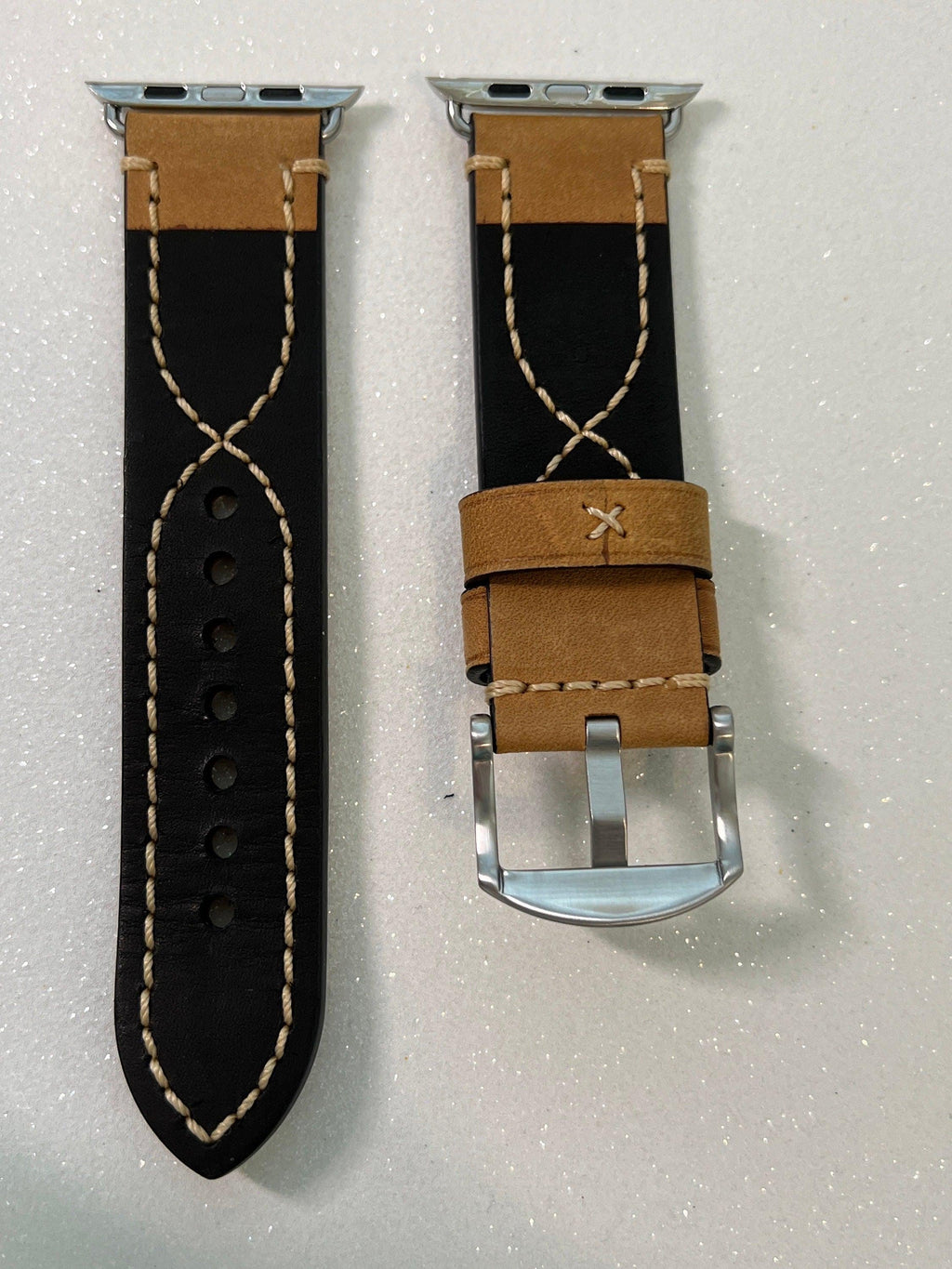 Rugged High Quality Apple Watch Band Tan/Brown Hand Stitched Leather fits 49mm Ultra 1 or 2 & 42mm, 46mm Series 10, 45mm Series 7/8/9, 44mm Series 4/5/6 SE. This Apple Watch Band will a wrist from size 6" at the smallest up to an 8.5". This is a thick high quality leather apple watch band with custom natural color stitching with silver connectors and matte silver buckle. It is a wide band at 24mm wide.