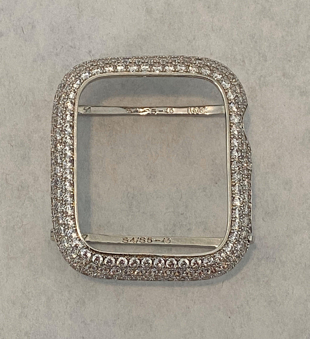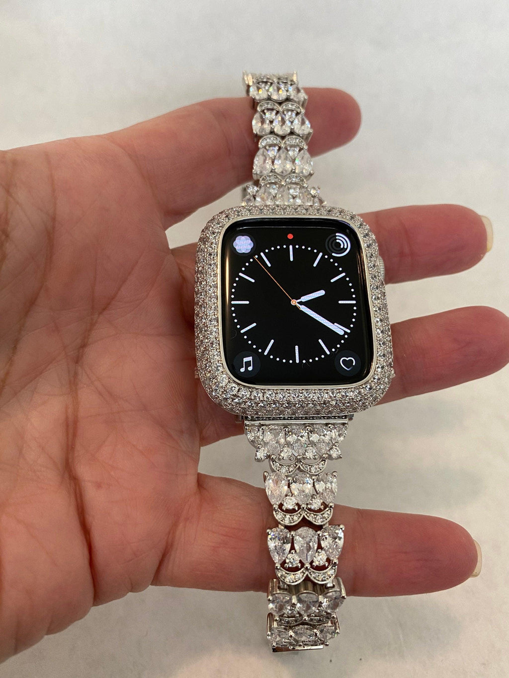 Apple Watch Case Materials: 14kt White gold plating over a metal base with hand set pave lab created diamonds. Two bars on the back hold the Apple Watch in place with access to all buttons. There is NO screen protector. Instructions Included.